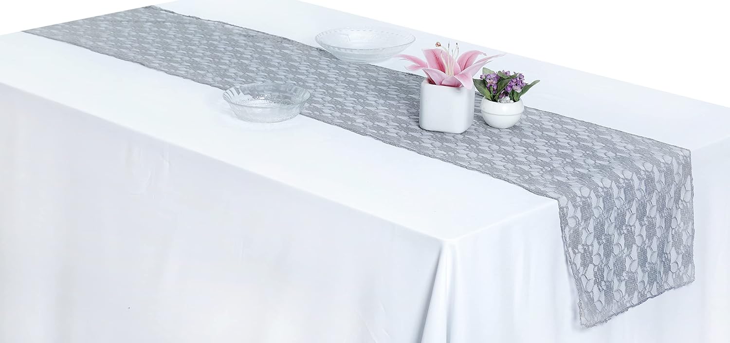 MDS Pack of 25 Wedding 12 x 108 inches Lace Table Runner for Wedding, Decorations for Birthday Parties, Banquets, Graduations, Engagements, and Runners fit Rectangle, Round Table- Silver Gray