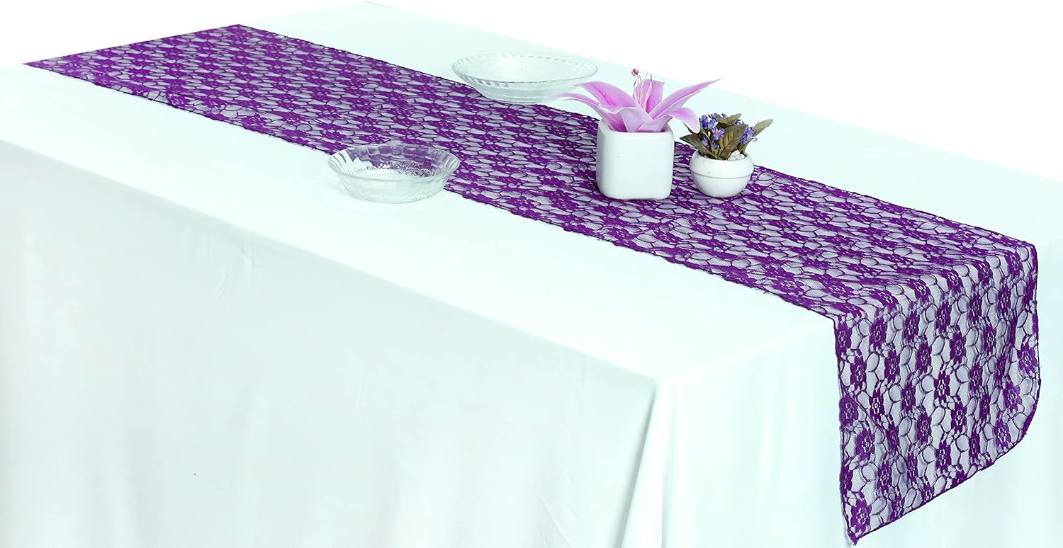 MDS Pack of 15 Wedding 12 x 108 inches Lace Table Runner for Wedding, Decorations for Birthday Parties, Banquets, Graduations, Engagements, and Runners fit Rectangle, Round Table- Purple