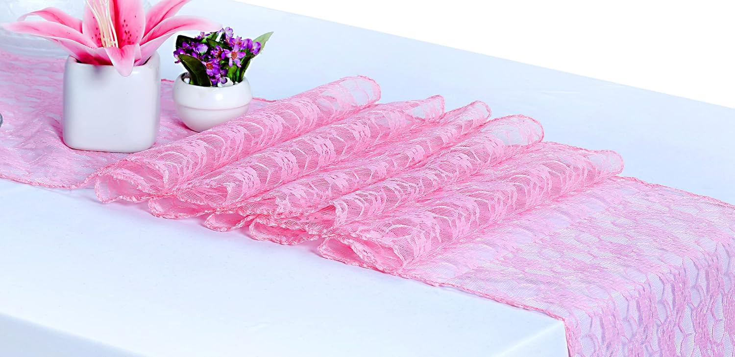 MDS Pack of 10 Wedding 12 x 108 inches Lace Table Runner for Wedding, Decorations for Birthday Parties, Banquets, Graduations, Engagements, and Runners fit Rectangle, Round Table- Pink