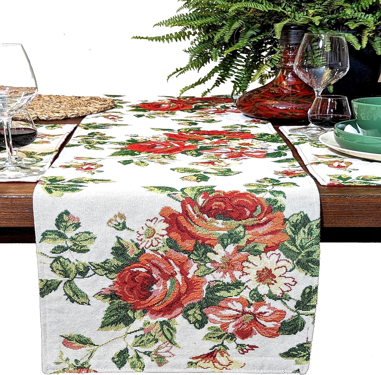 - This table runner features bouquets of antique roses surrounded by leaves and small flowers branching out of the bouquet and a light background to enhance the color of the roses. Colors are; ivory, creamy beige, ruby red, bright green, and light yellow.