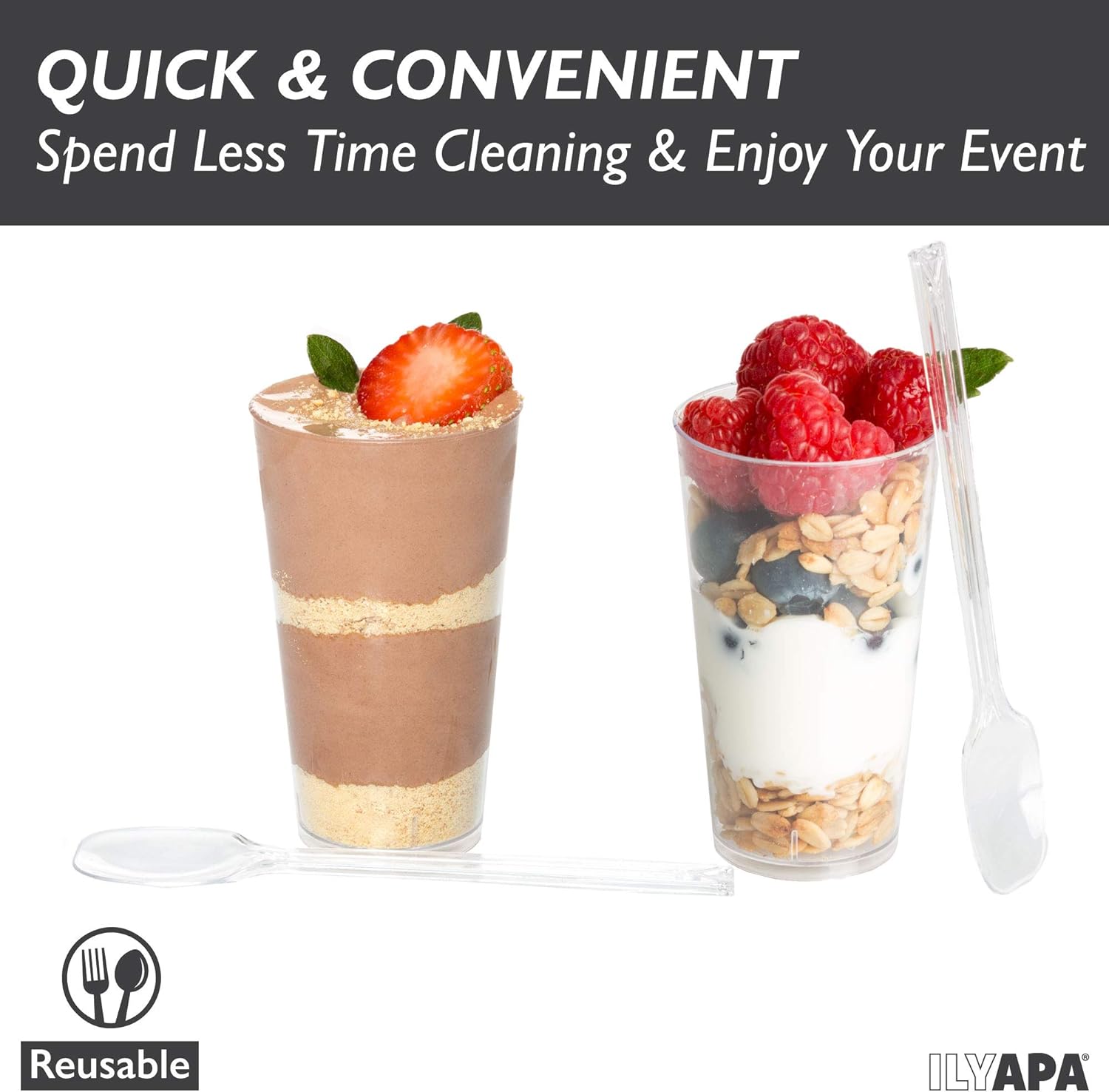 - Satisfaction Guaranteed - ILYAPA stands behind all of its products 100%. We use strong durable packaging to guarantee that your mini plastic dessert cups arrive in the best condition possible.