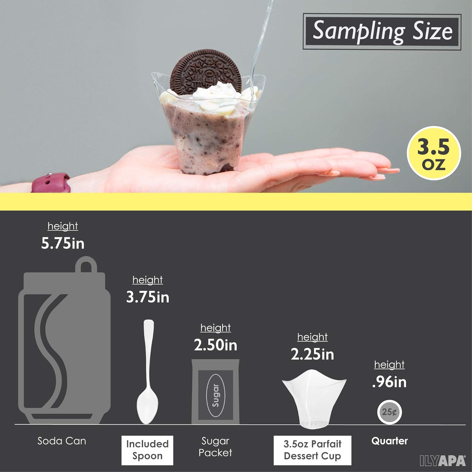 - Enhance any Occassion - With these stylish and premium dessert shooter cups! These 3.5oz parfait plastic serving cups come with 100 spoons, everything you need to serve 100 guests. These small desert cups are perfect for breakfast, brunch, appetizers, and more!