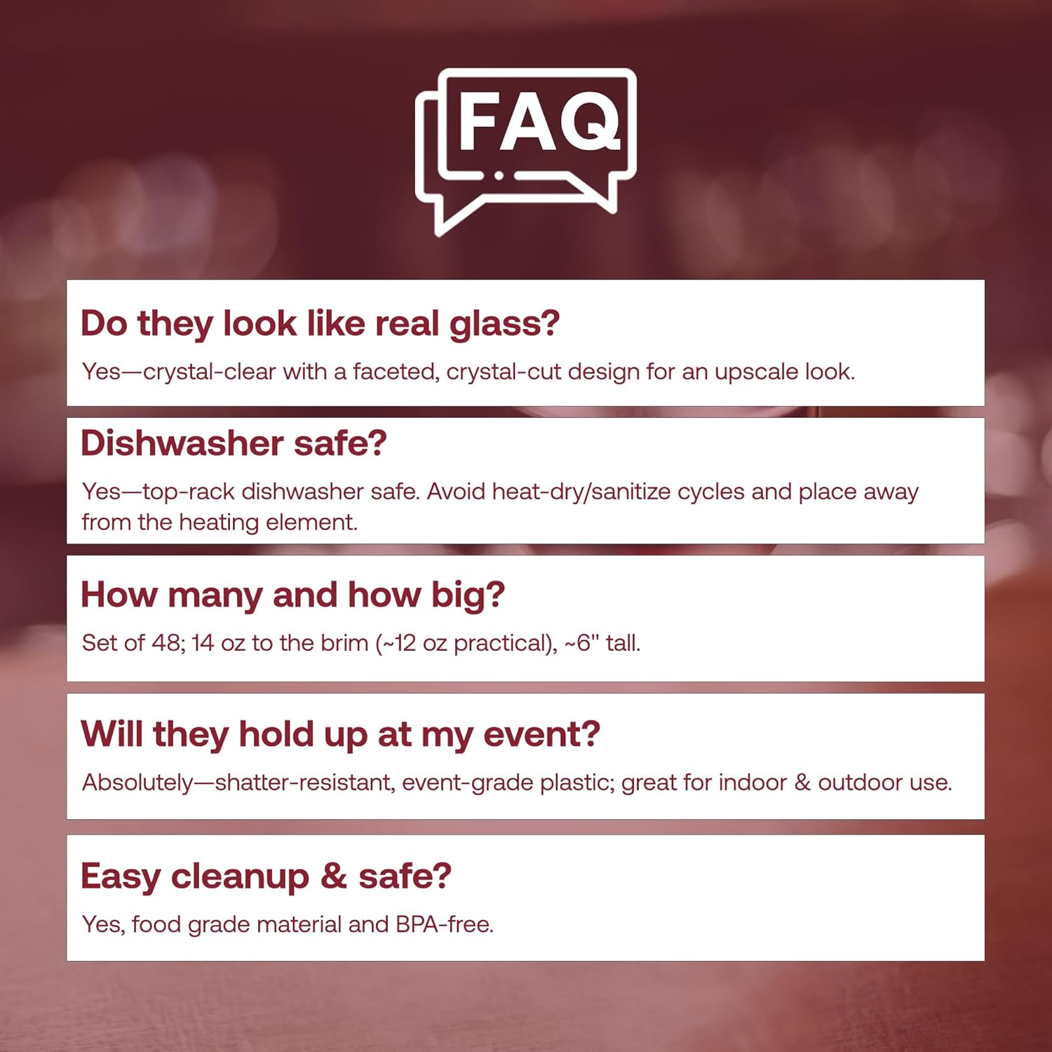 - PACK & SPECS: Set of 48 clear crystal-cut tumblers (12 packs of 4). Flush fill 14 oz, practical 12 oz; approx. 6" tall, 2.5" top dia, 3" base. Sturdy walls and a stable footprint make these 14 oz plastic cups service-ready for busy bars and buffets.