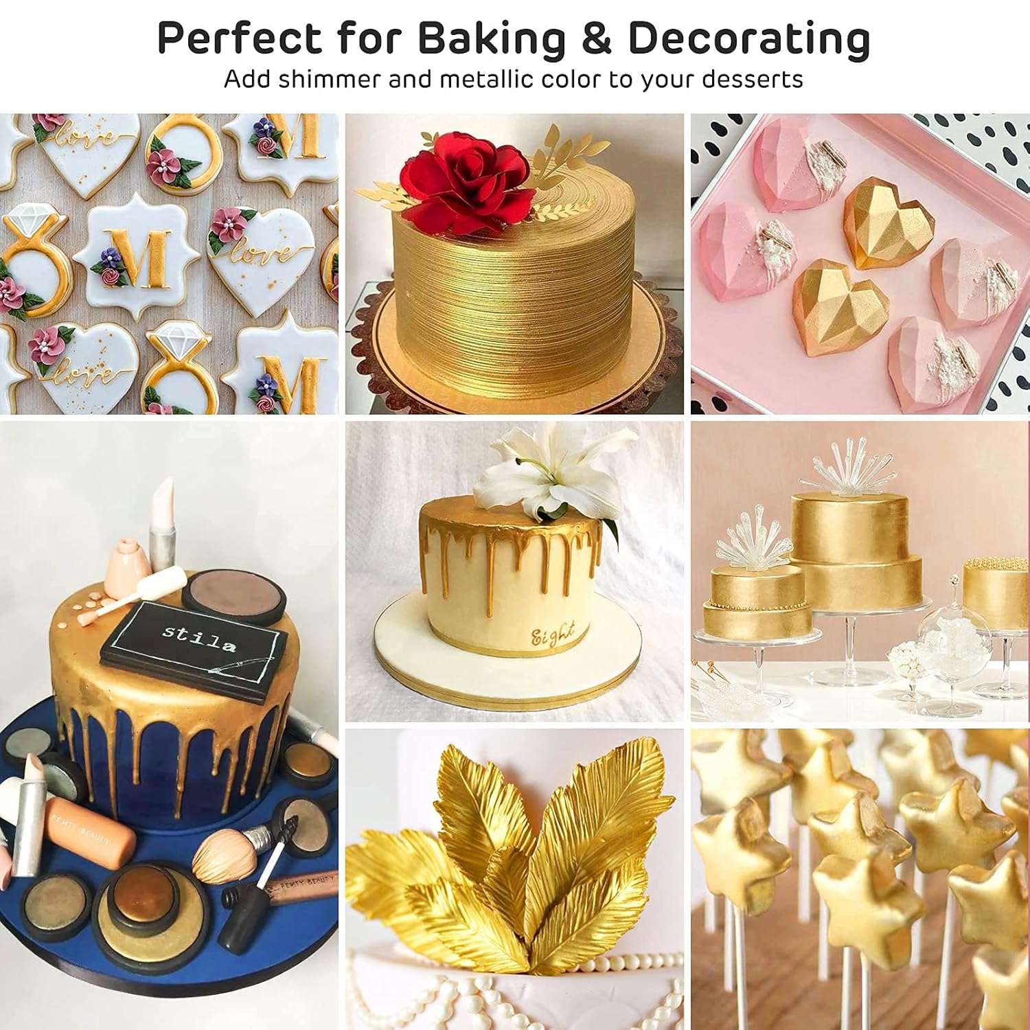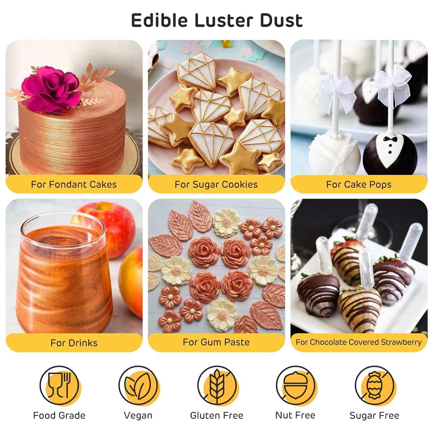 - WIDELY USED FOR BAKING -- The luster dusts is ideal for decorating fondant, gumpaste, royal icing cookies, buttercream, chocolate, candy apple, macaroons, cakes and so on; You can also create shimmery cocktails, champagne or any drink by adding a little edible luster to your beverage, have some fun