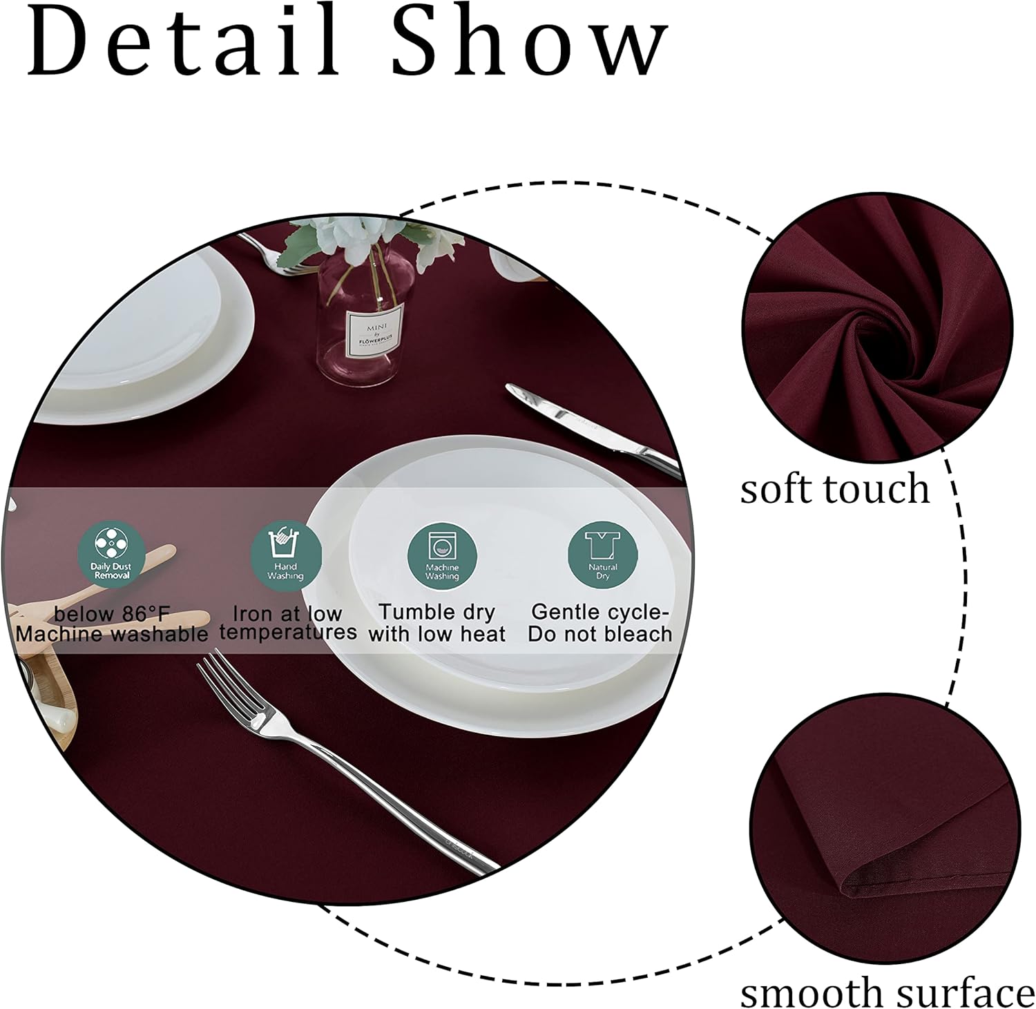 - EASY TO CARE: Our polyester tablecloth is machine washable and not easily deformed. You can wash with cold water and do not bleach. Iron on low heat if required.