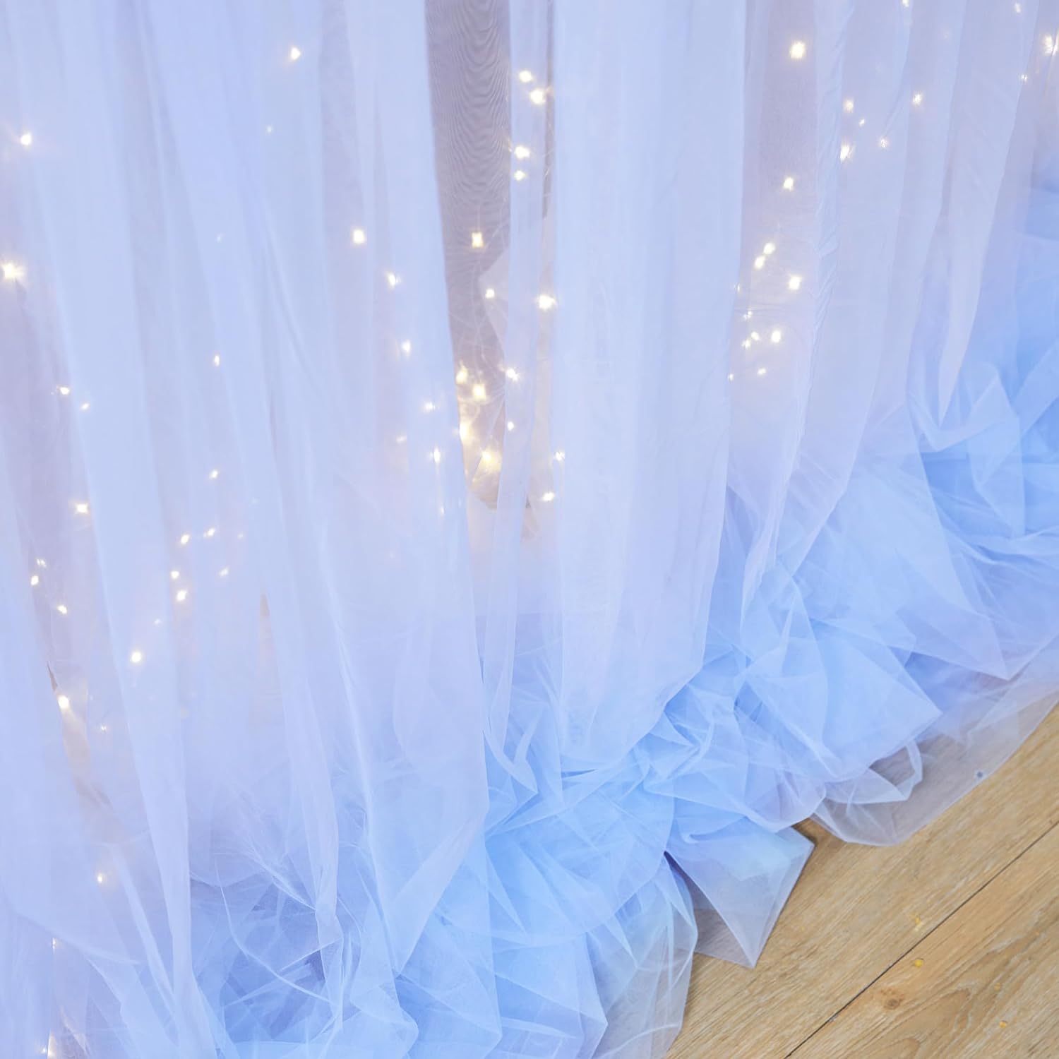 - Products include: 10ft×10ft baby blue sheer tulle backdrop curtain, a set of 9.8ft warm white string light and 12pcs Transparent clips (no remote control).