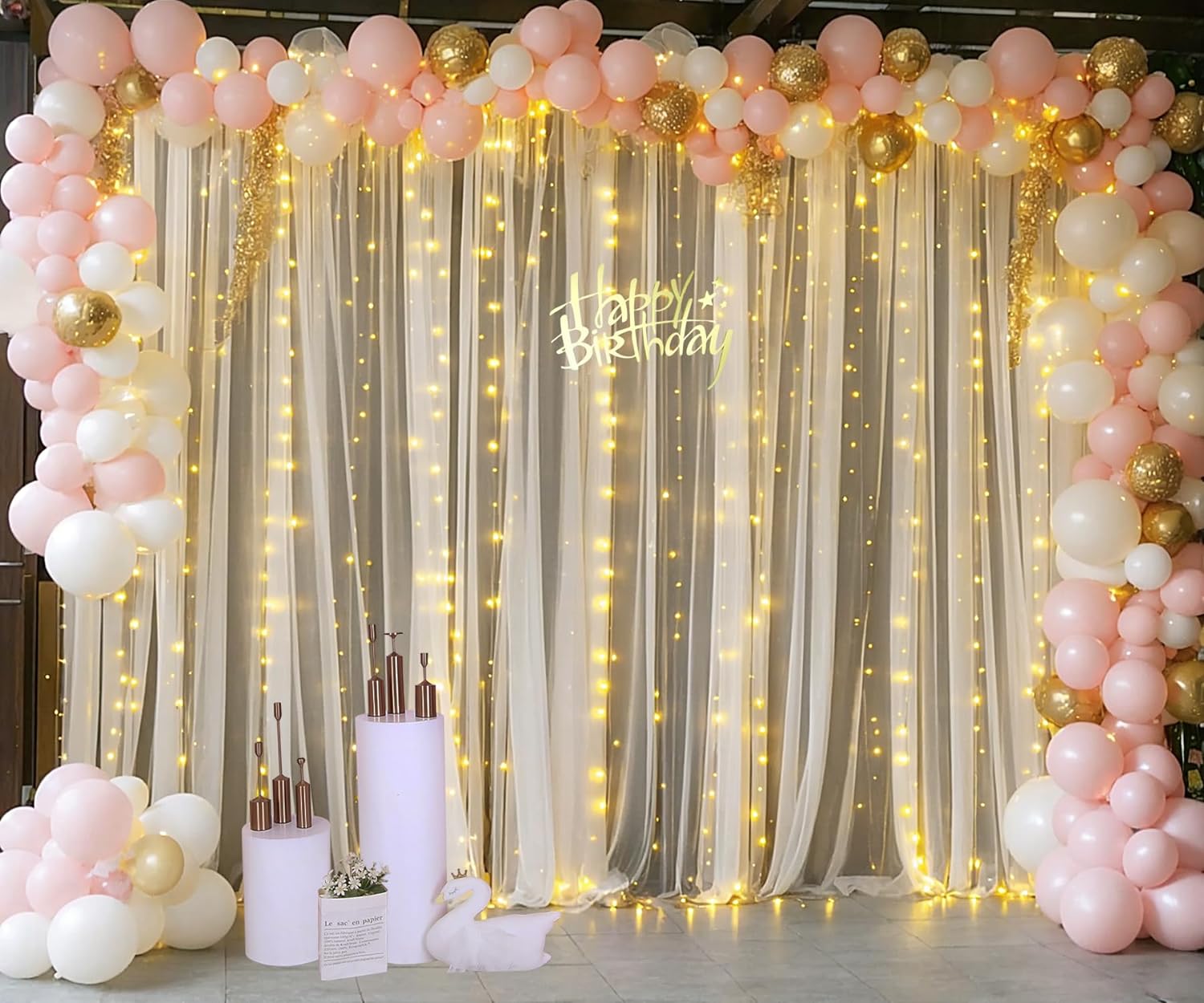 - Products include: 10ft×8ft wrinkle free champagne curtain backdrop, a set of 9.8ft warm white string light and 12pcs Transparent clips (no remote control).