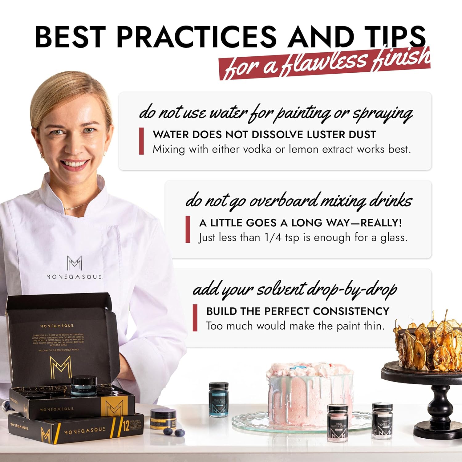 - EASY TO USE: Our burgundy luster dust is incredibly versatile. Apply with a wet brush, airbrush, or dry brush, and even mix into beverages. Achieve professional-looking results effortlessly at home, whether decorating halloween cakes or adding shimmer to cocktails.