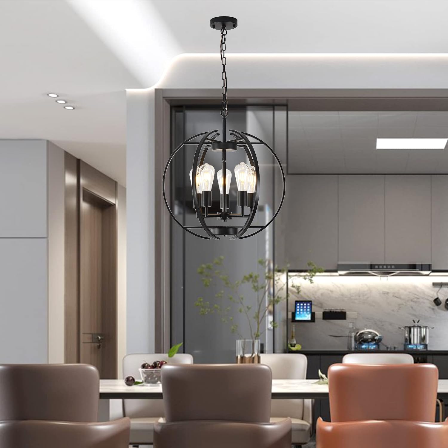 Large Lantern Globe Black Chandelier Lighting, Adjustable Hanging Ceiling Pendant 5 Light for Kitchen, Dining Room, Living Room, Hallway, Bedroom