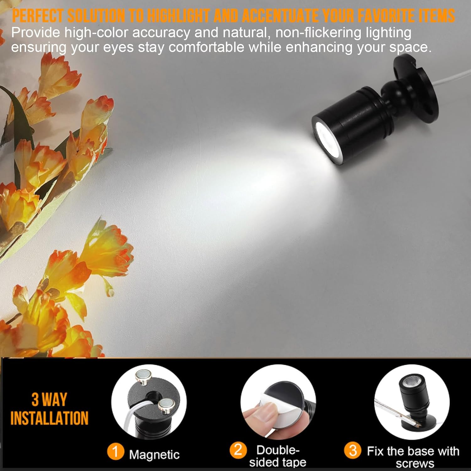 - 【Comfortable & Bright Illumination】Each display lights has 1.5 Watt,100 lumens and 6.6ft length cord.Cold White 6000K,With a Color Rendering Index of 85RA, our spotlights provide high-color accuracy and natural, non-flickering lighting, ensuring your eyes stay comfortable while enhancing your space.