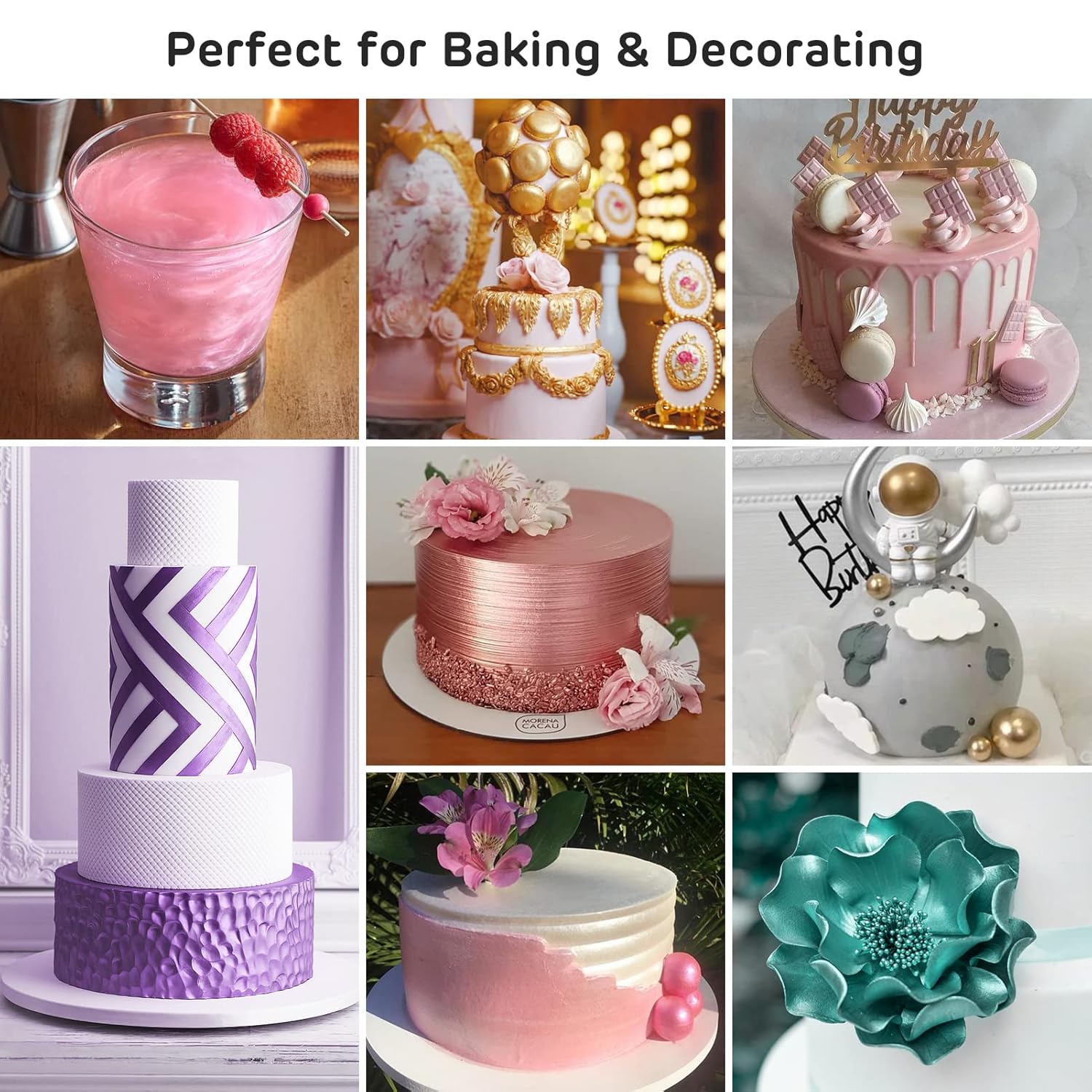 - WIDELY USED FOR BAKING -- The luster dusts is ideal for decorating fondant, gumpaste, royal icing cookies, buttercream, chocolate, candy apple, macaroons, cakes and so on; You can also create shimmery cocktails, champagne or any drink by adding a little edible luster to your beverage, have some fun