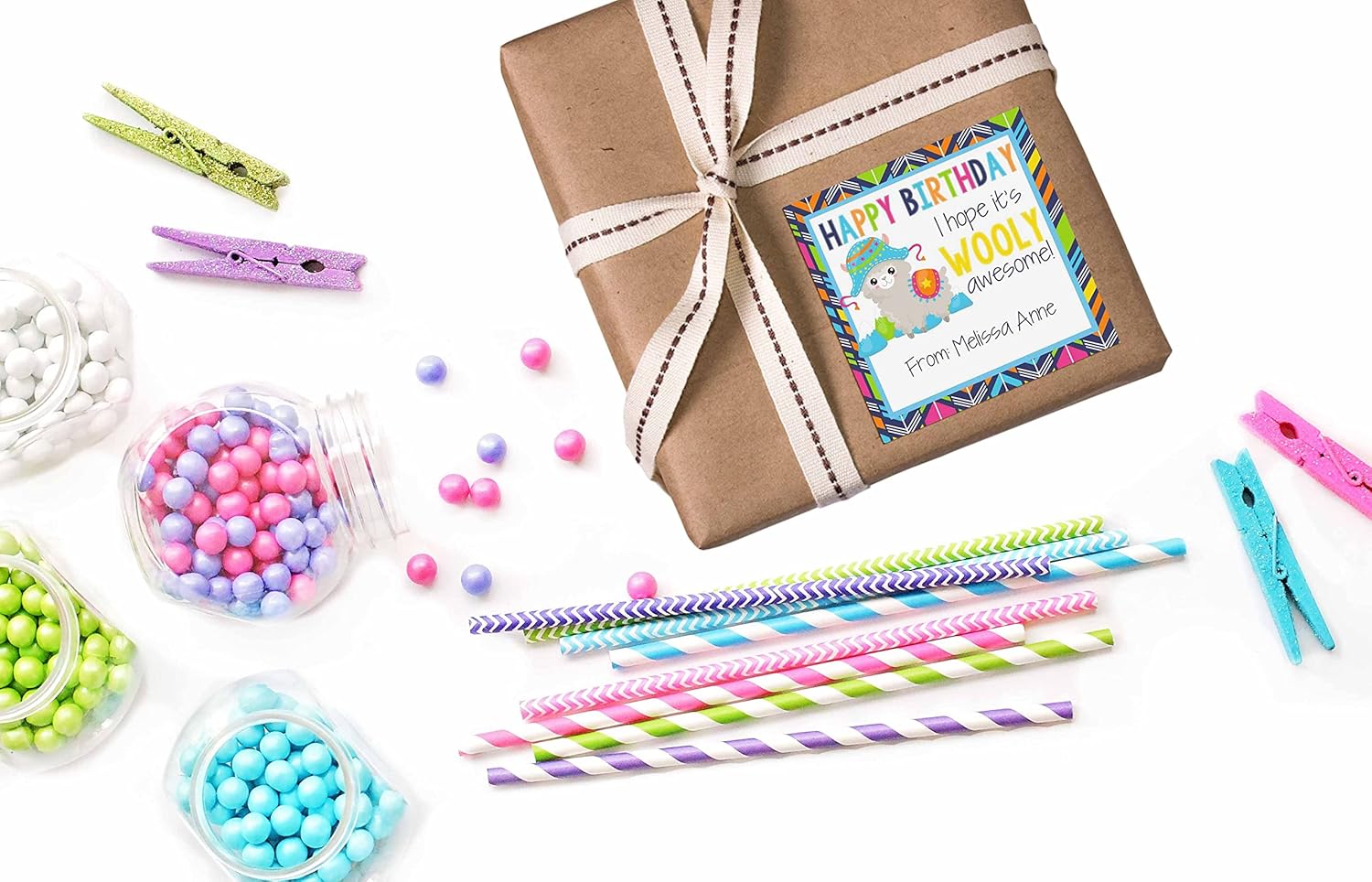 - Cuteness Overload: Designed by a talented mom, these colorful stickers feature an adorable alpaca theme. The clever message of "wooly awesome" birthday wishes is the perfect way to honor the birthday boy or girl. Each sticker will be custom printed and personalized just for you! Amanda Creation. Original design by Amanda Creation.