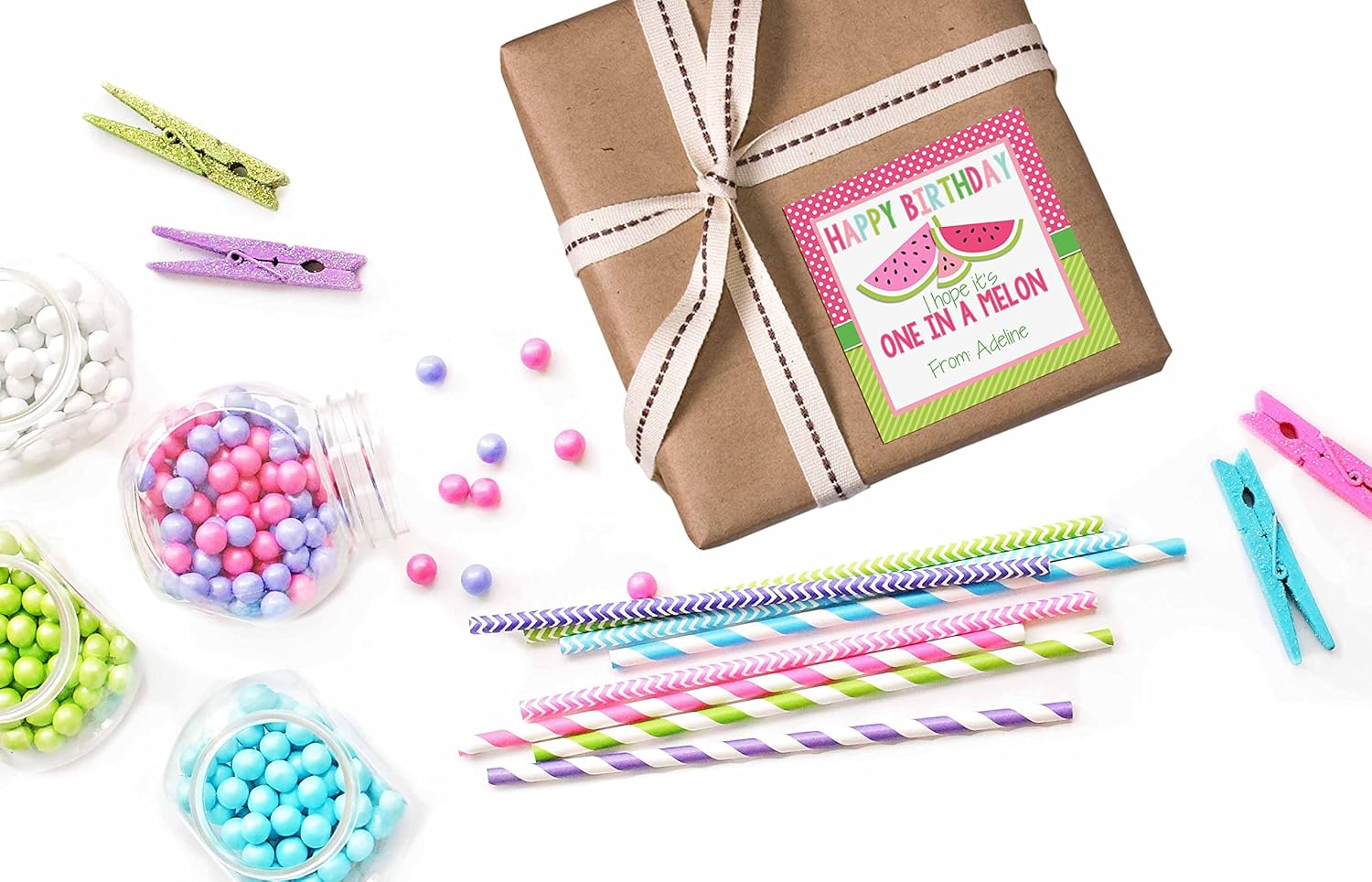 Custom & Personalized One in A Melon Watermelon Happy Birthday Gift Tag Sticker Labels, 24 2.5" Square Stickers by Amanda Creation
