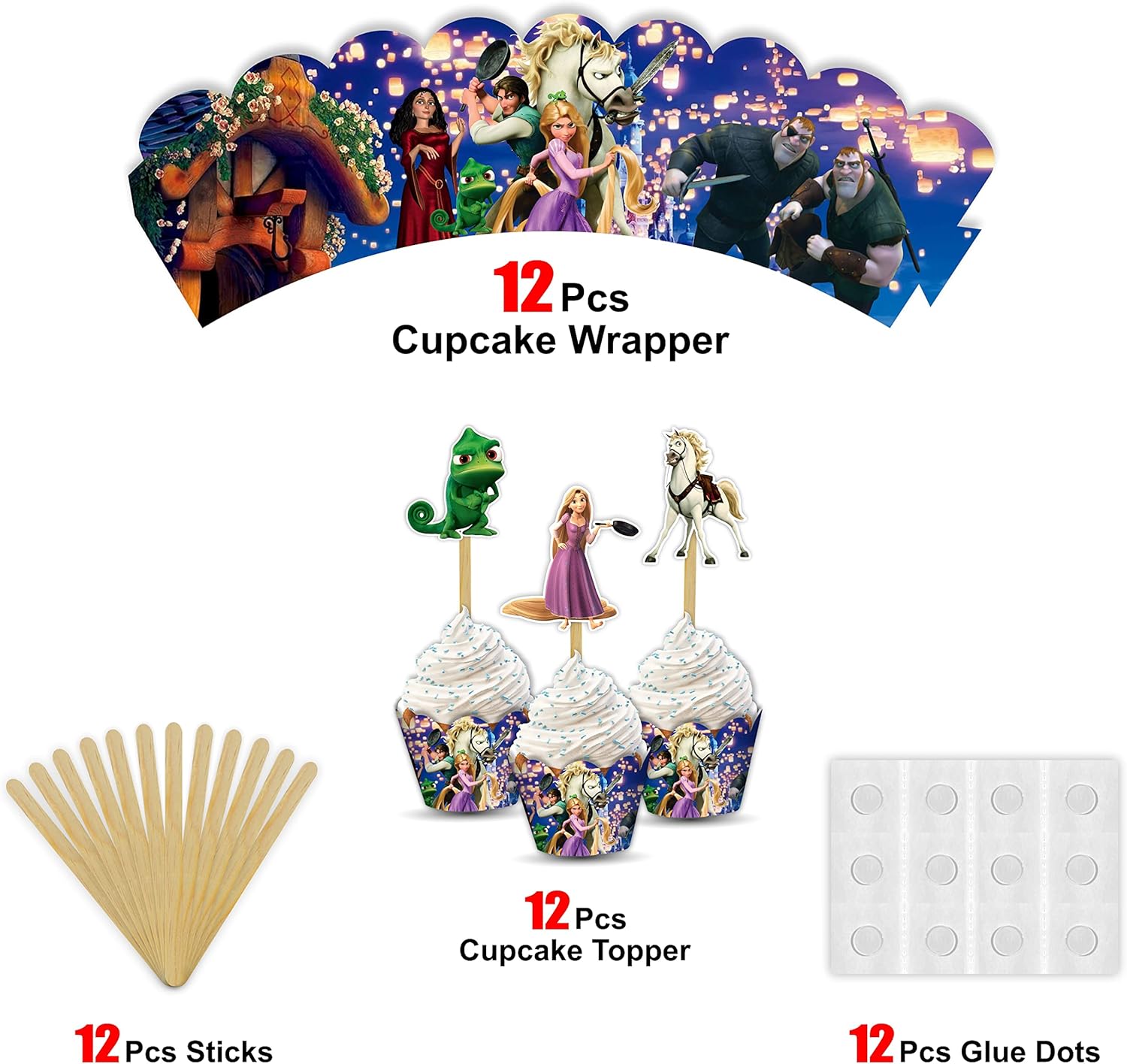 - 👑 Princess-Inspired Design – Beautiful Rapunzl Cupcake Wrappers featuring Tangled-inspired patterns with vibrant princess theme colors, perfect for magical birthday celebrations.