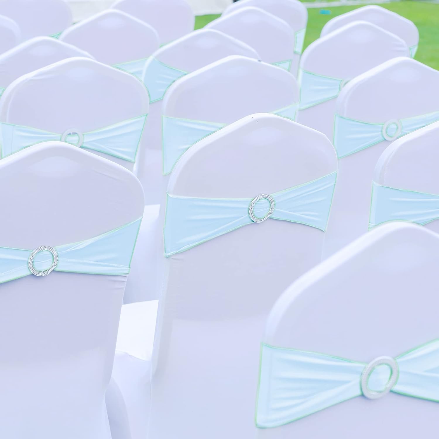 CHENGU 150 Pieces Spandex Stretch Chair Sashes Bows Elastic Chair Cover Bands Ties with Buckle Slider for Wedding Party Reception Events Universal Ceremony Banquet Decorations (Sky Blue)