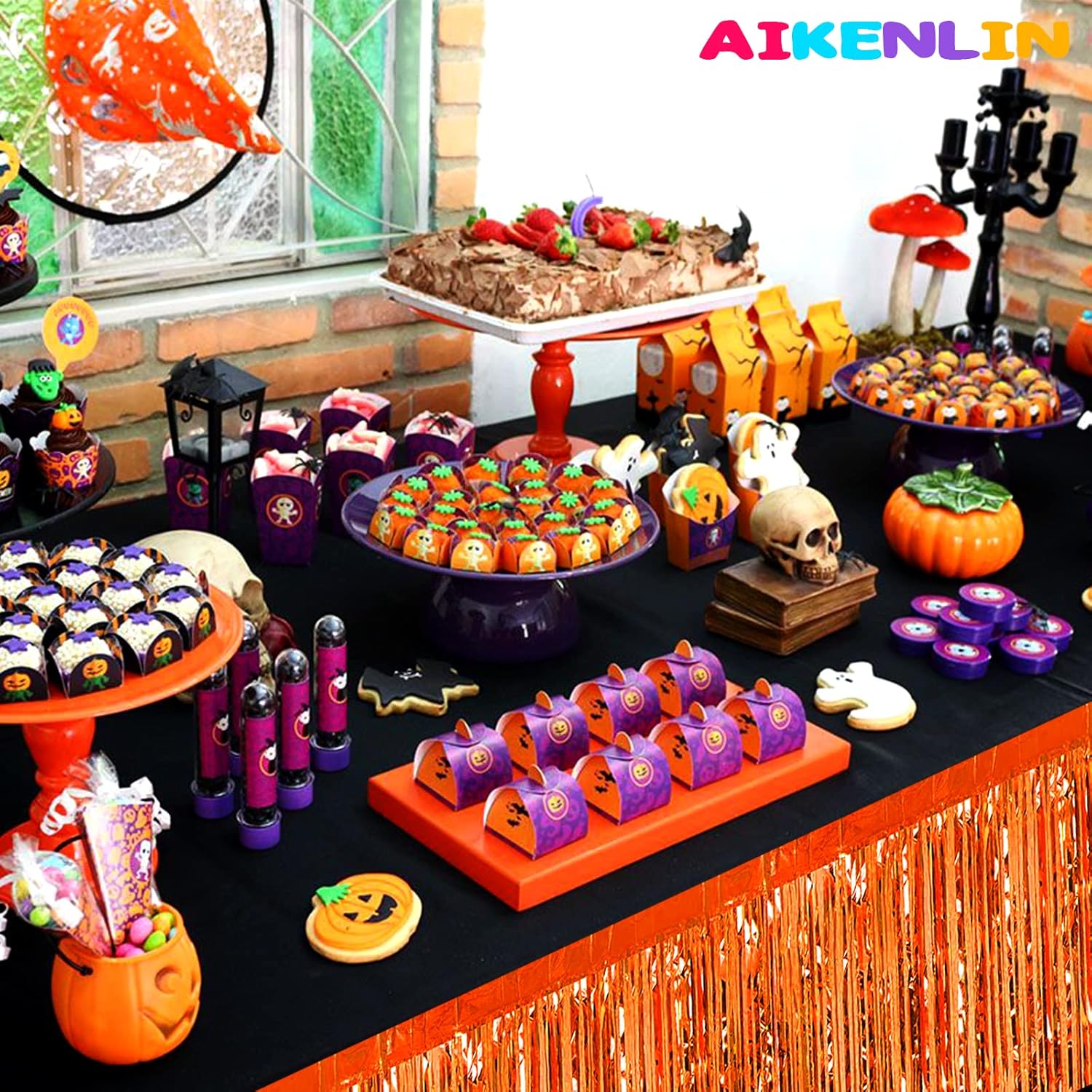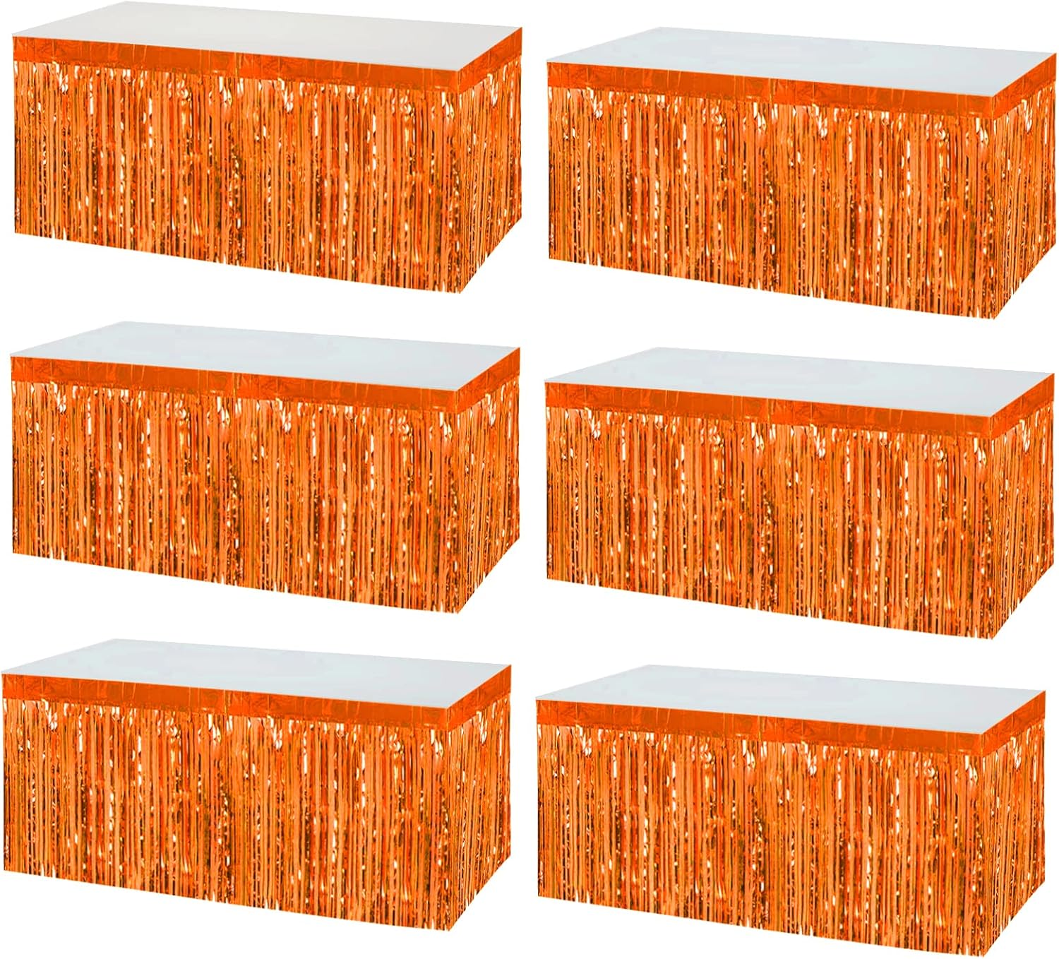 6 Pack 29x108 Inch Orange Metallic Foil Fringe Tinsel Table Skirts Banner for Rectangle Tables Streamer Garland Curtains Backdrop for Wedding, Birthday, Parade Floats, Christmas Party Decoration