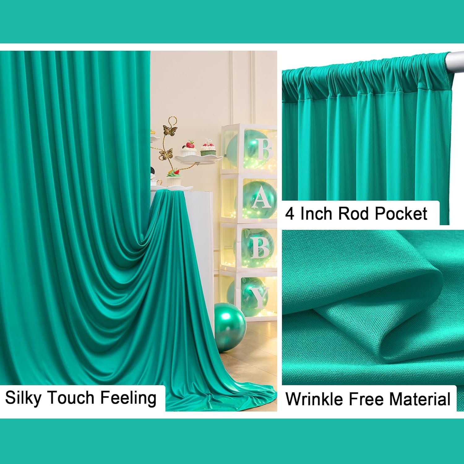 - Make Your Party Pops:You can add some flowers,greenery,balloons, party streamers, fun banners, balloon arch, butterflies, paper stars, tissue paper flower prop, confetti,twinkle lights to make your polyester backdrop for a gorgeous look! Teal wedding drapes for wedding can be hand wash or machine wash.