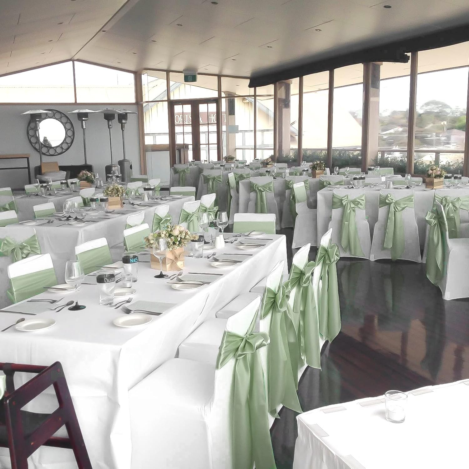 fani 60 PCS Sage Green Satin Chair Sashes Bows Universal Chair Cover for Wedding Reception Restaurant Event Decoration Banquet,Party,Hotel Event Decorations (7 x 108 inch)