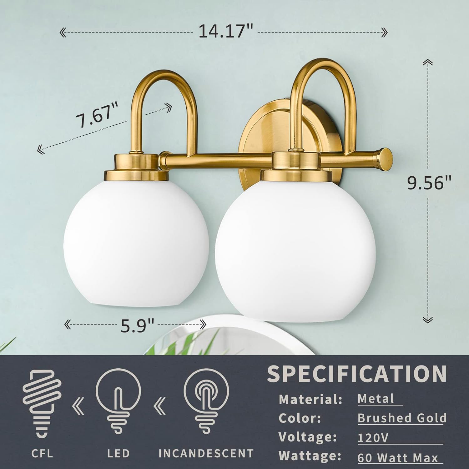 - UP/DOWN INSTALLATION: This gold bathroom light fixtures can be mounted facing upward for ambient lighting and facing downward for task lighting, meets all kinds of mirror and lighting needs. Product measures: 14.17”(L) x 9.56”(H) x 7.67”(Ext.).