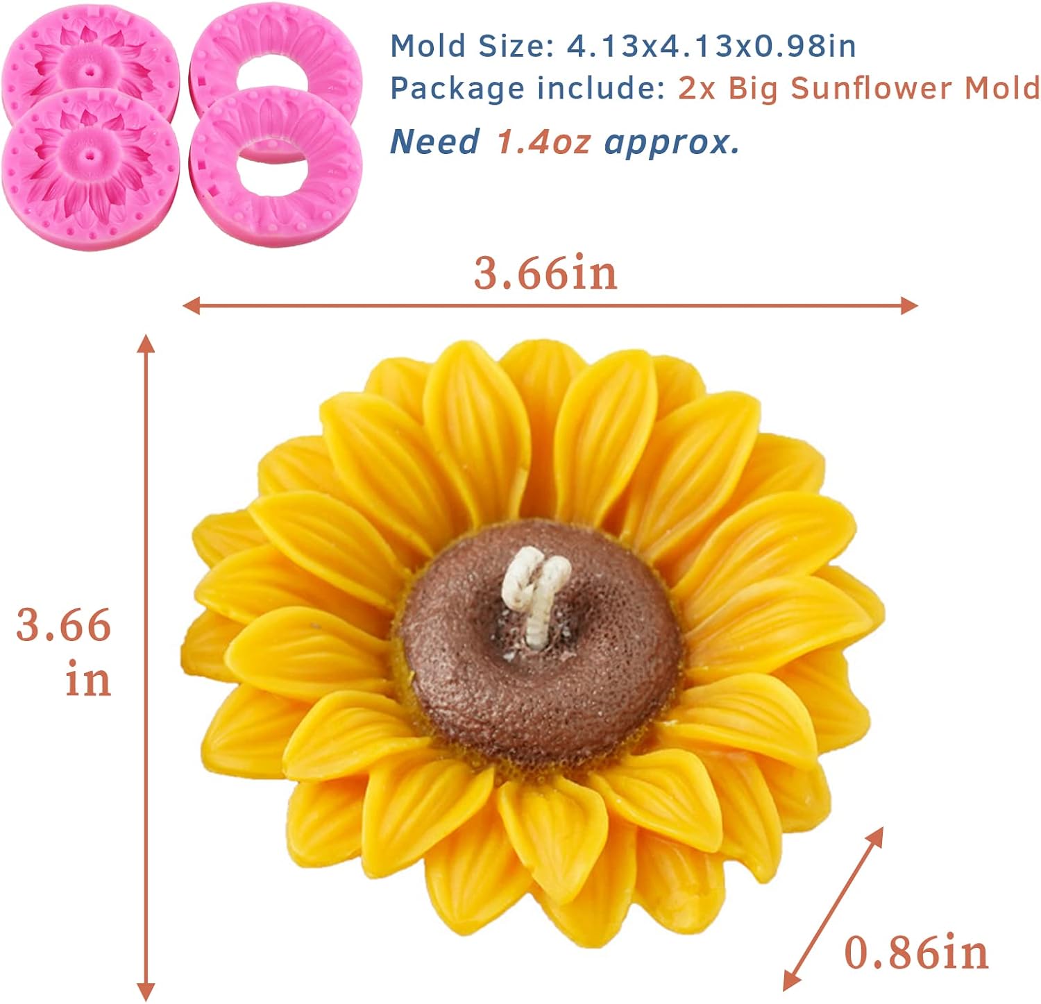 - 【PRACTICAL SIZE】The package includes 2x Big Sunflower Silicone Mold. Each product size is about 9.3x9.3x2.2cm/3.66x3.66x0.86 in, need about 1.5oz. Practical size for making daily use soap candle and so on