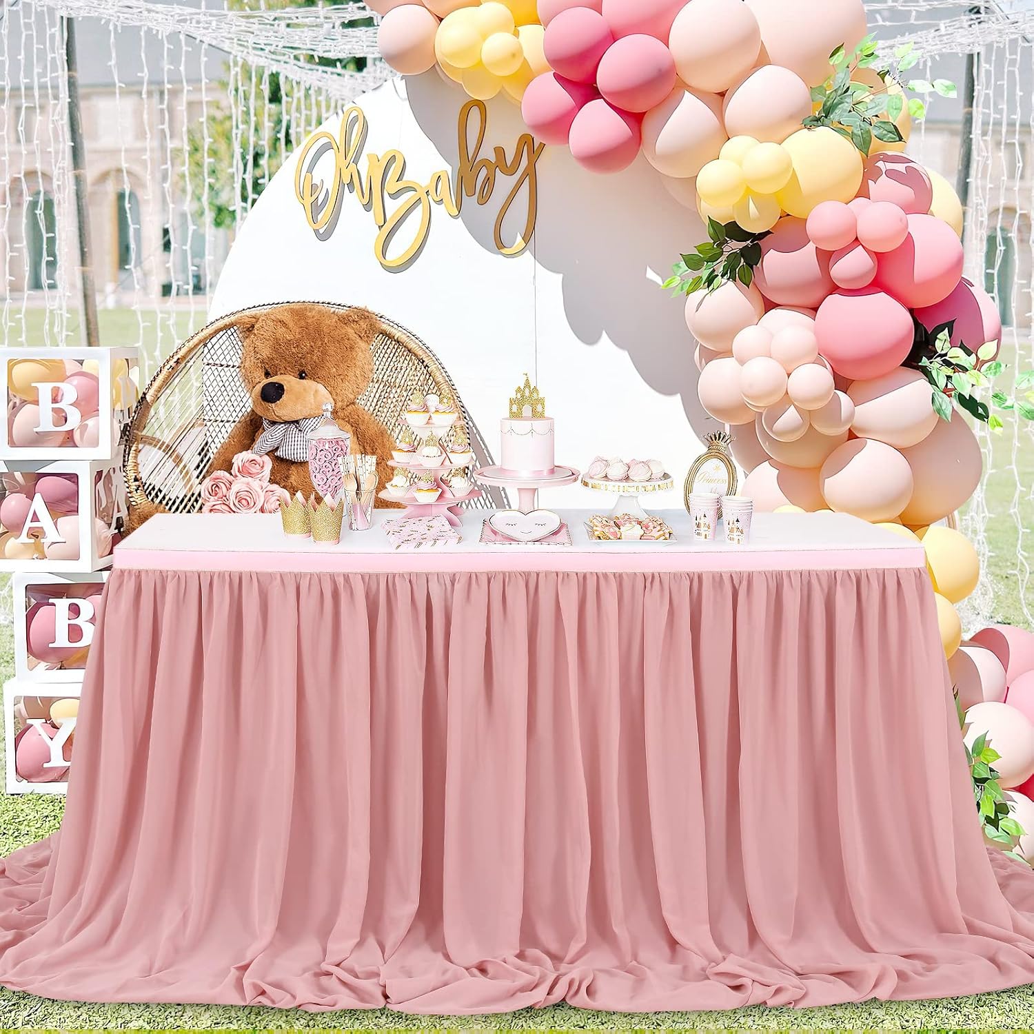 - 💡 Dusty Rose Table Skirt Material: The extra long chiffon table skirt is made of Sheer Chiffon which is wrinkle-free, soft, and with a nice drapery. Table skirt both robust for kids birthday party supplies and elegant if used for wedding decoration.