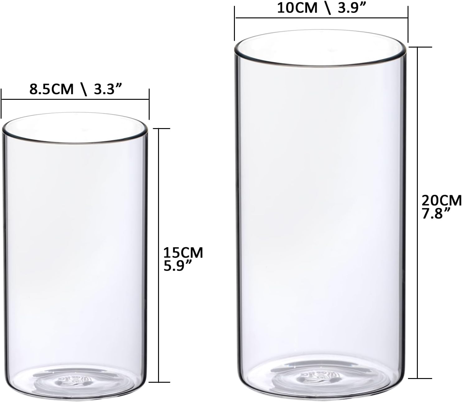 - Clear Cylinder Vases: Crafted from premium high borosilicate glass, our clear vases offer exceptional durability, heat resistance, and transparency. The classic cylinder design ensures that these flower vase won't go out of style, while the smooth top edges add an extra touch of sophistication. Use them to effortlessly decorate your shelf, fireplace, or office