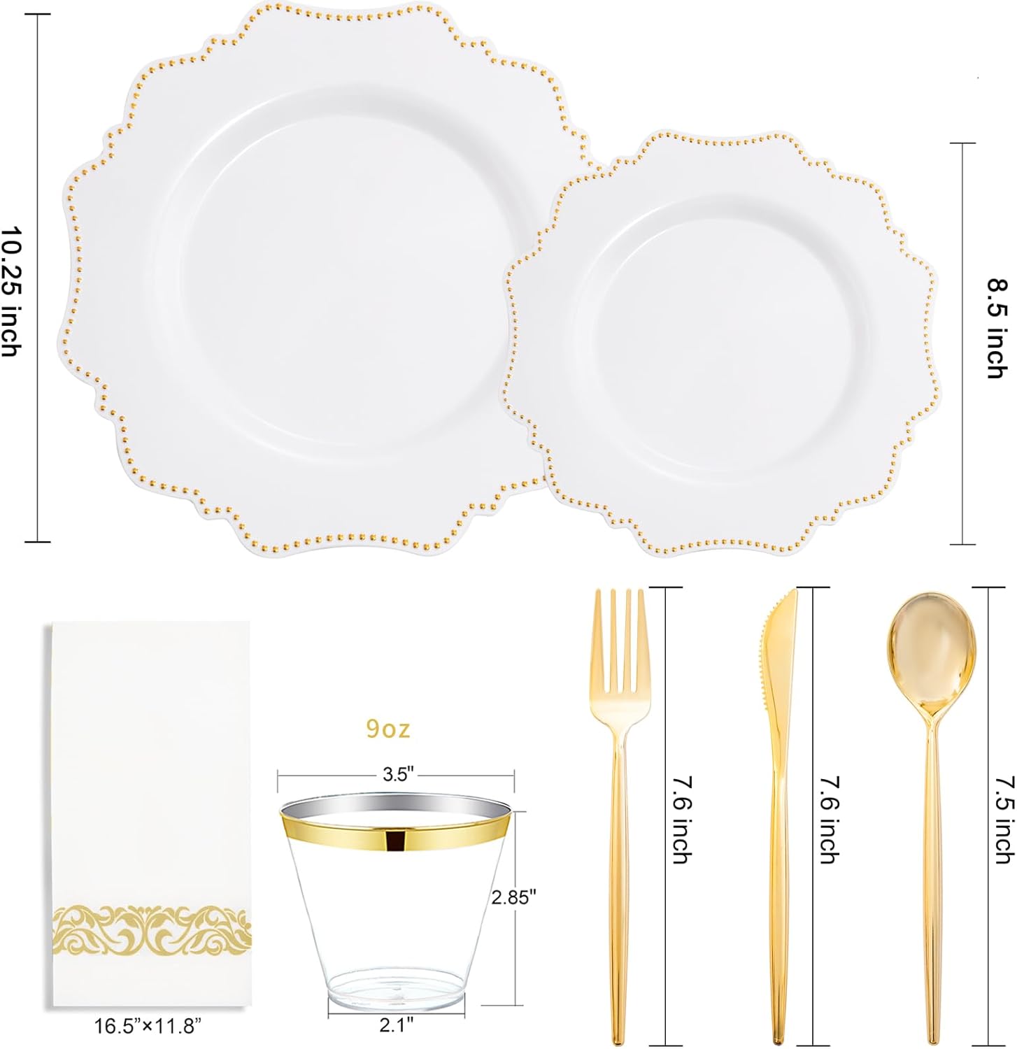 - PLASTIC PARTY PLATES SET: A Complete Disposable Heavy Duty New Year Party Plastic Plates . White and Gold Plastic Party Plates & Gold Plastic Silverware - Include 25 Dinner Plates, 25 Dessert Plates, 25Forks, 25Spoons, 25Knives, 25Cups and 25Napkins For Wedding & Party