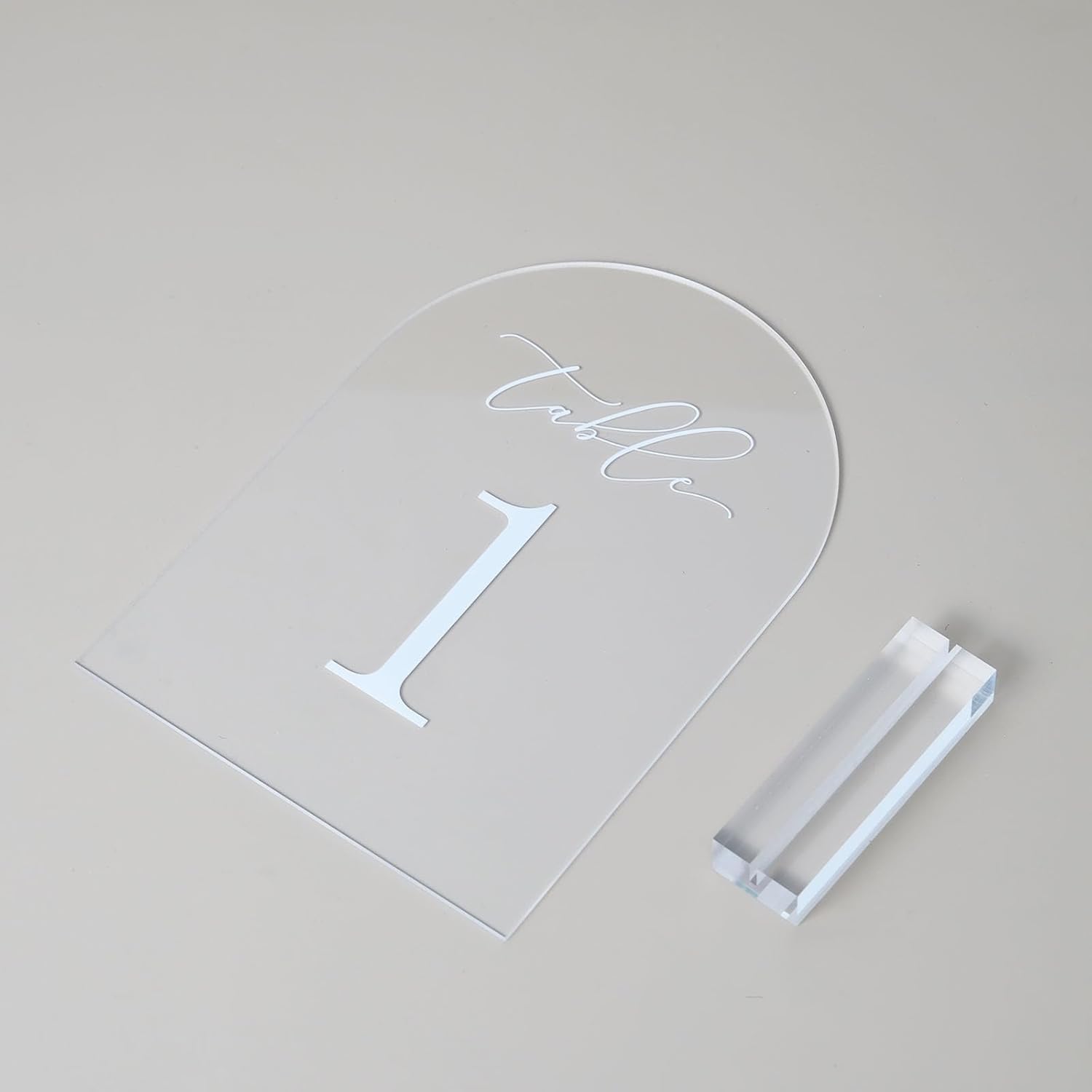 - Clear Arch Table Numbers with Acrylic Stands: Arched acrylic is so on trend for this year's wedding decorations. These gorgeous arch acrylic wedding table numbers will look stunning on your tables and go with any wedding style, from rustic through to timeless and classic.