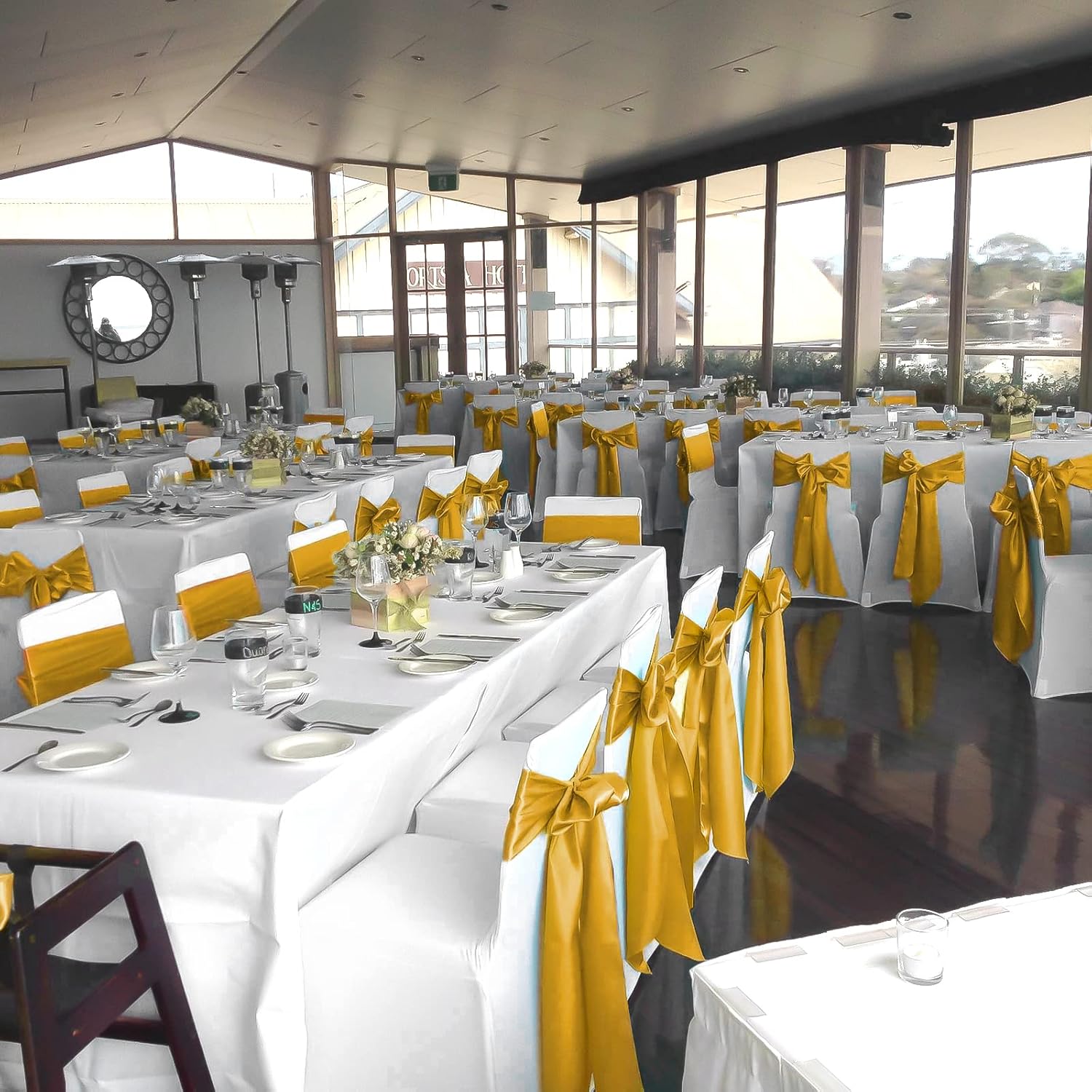 fani 120 PCS Gold Satin Chair Sashes Bows Universal Chair Cover for Wedding Reception Restaurant Event Decoration Banquet,Party,Hotel Event Decorations (7 x 108 inch)