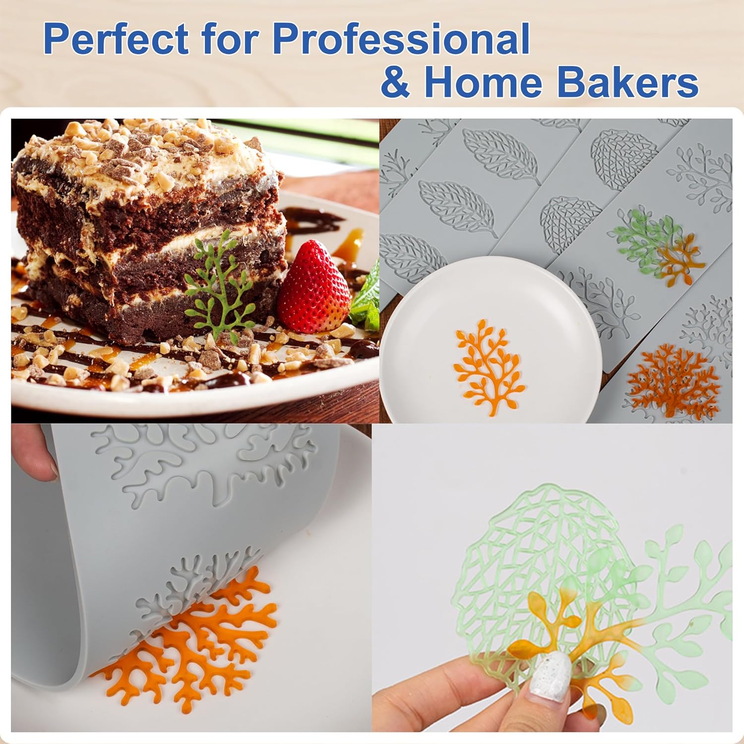 - Silicone Leaf Molds: 5 different pattern quilted leaf chocolate molds coral branch leaves fondant lace pad, 1 dough scraper and 1 silicone spatula; This silicone baking mold set is well made and detailed