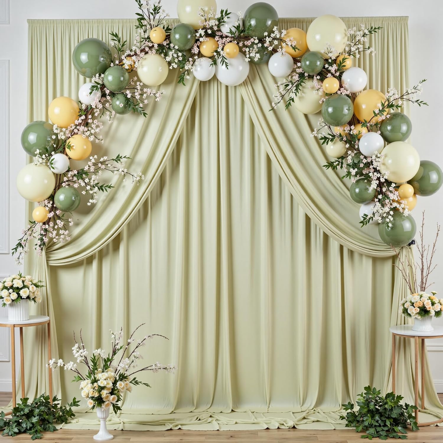 - Make Your Party Pops:You can add some flowers,greenery,balloons, party streamers, fun banners, balloon arch, butterflies, paper stars, tissue paper flower prop, confetti,twinkle lights to make your polyester backdrop for a gorgeous look! Sage Green backdrop stand drapes for wedding can be hand wash or machine wash.