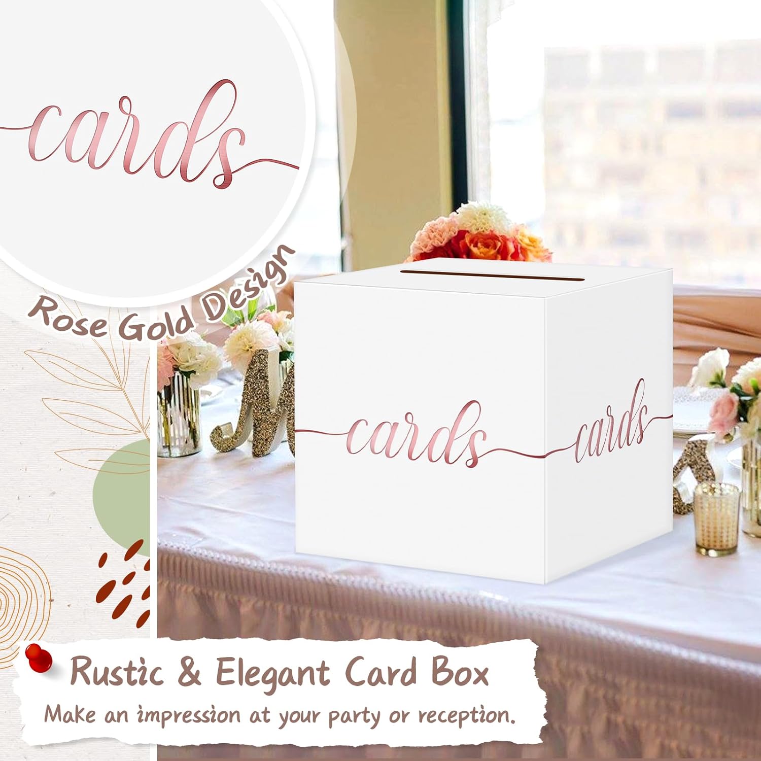 - Rose Gold Foil White Wedding Card Box Size: Pack of 1, card box measures 8.7 x 8.7 x 8.7 inches, large size to hold all sizes of envelope cards for weddings or parties.