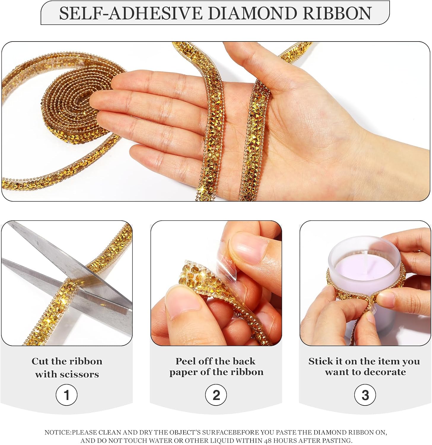 - Self-Adhesive Diamond Ribbon: The self-adhesive design with backing glue makes it possible to stick anywhere as long as the surface is smooth and clean. You cut the rhinestone ribbon into different lengths with scissors, then peel off the back paper of the sticker and paste it on the project you want to decorate.