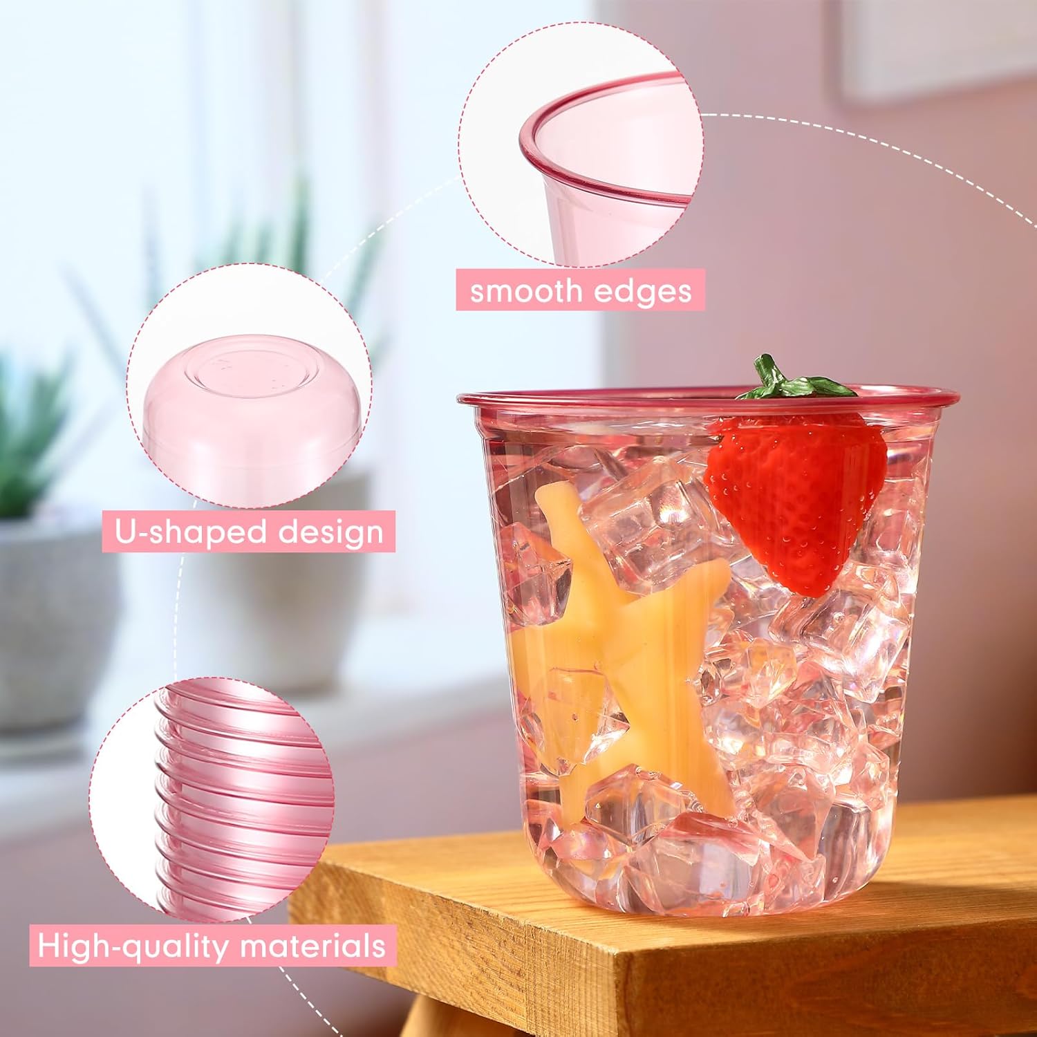 50 Pcs Disposable Stemless Glasses 12oz Crystal Plastic Wine Glasses Clear Classic Pet Cup for Meeting Weddings Birthdays Cocktail Christmas Party Supplies (Pink)
