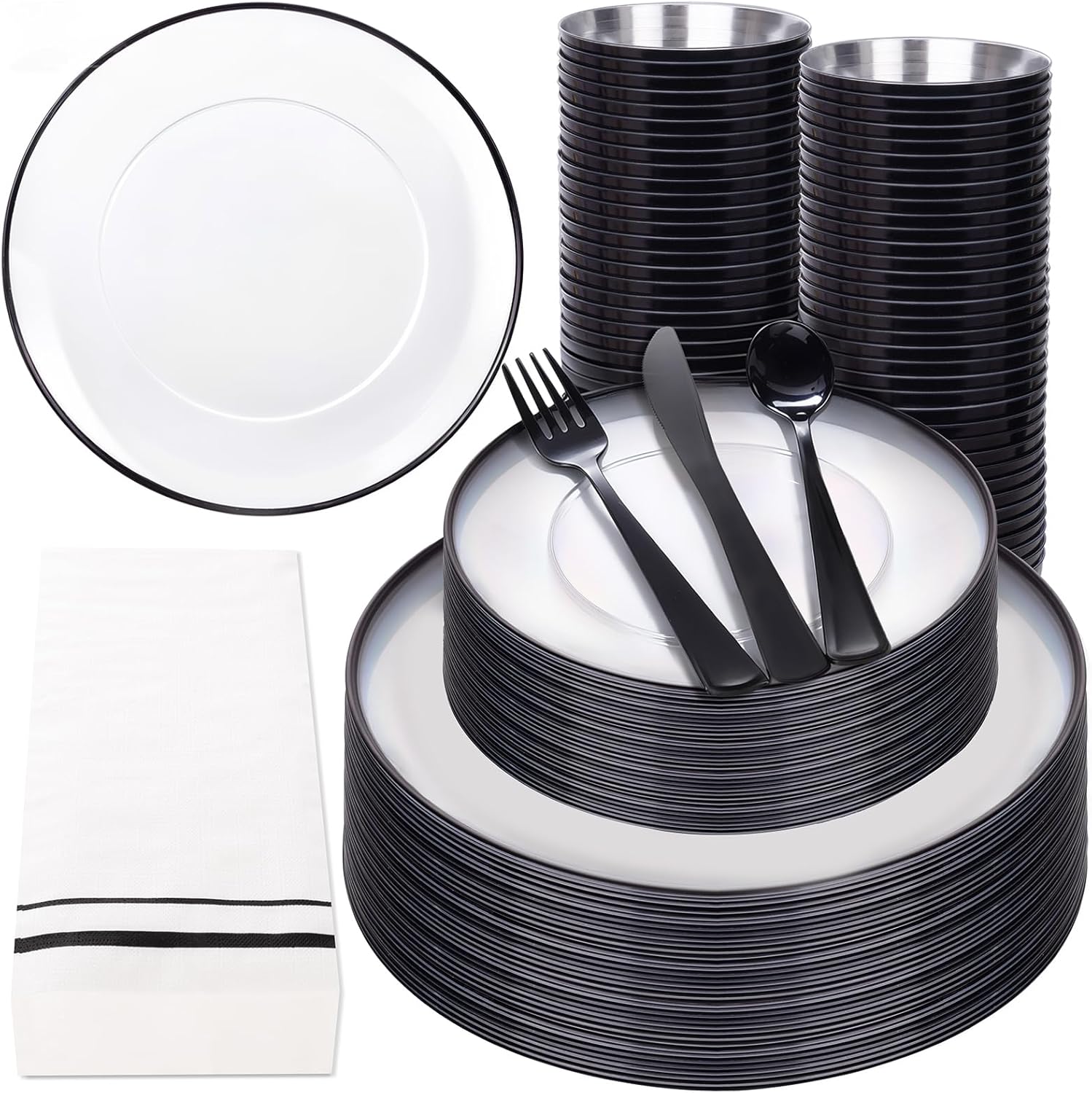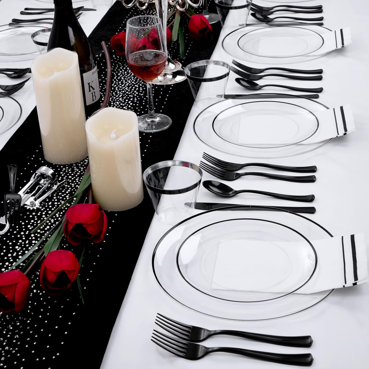 - FOR ANY OCCASION: Our clear plastic plates have a delicate design with a black edge, which makes it suitable for any occasion. You can use these black disposable dinnerware set for any party and occasion such as birthday,weddings,engagements,anniversaries,graduations and more.