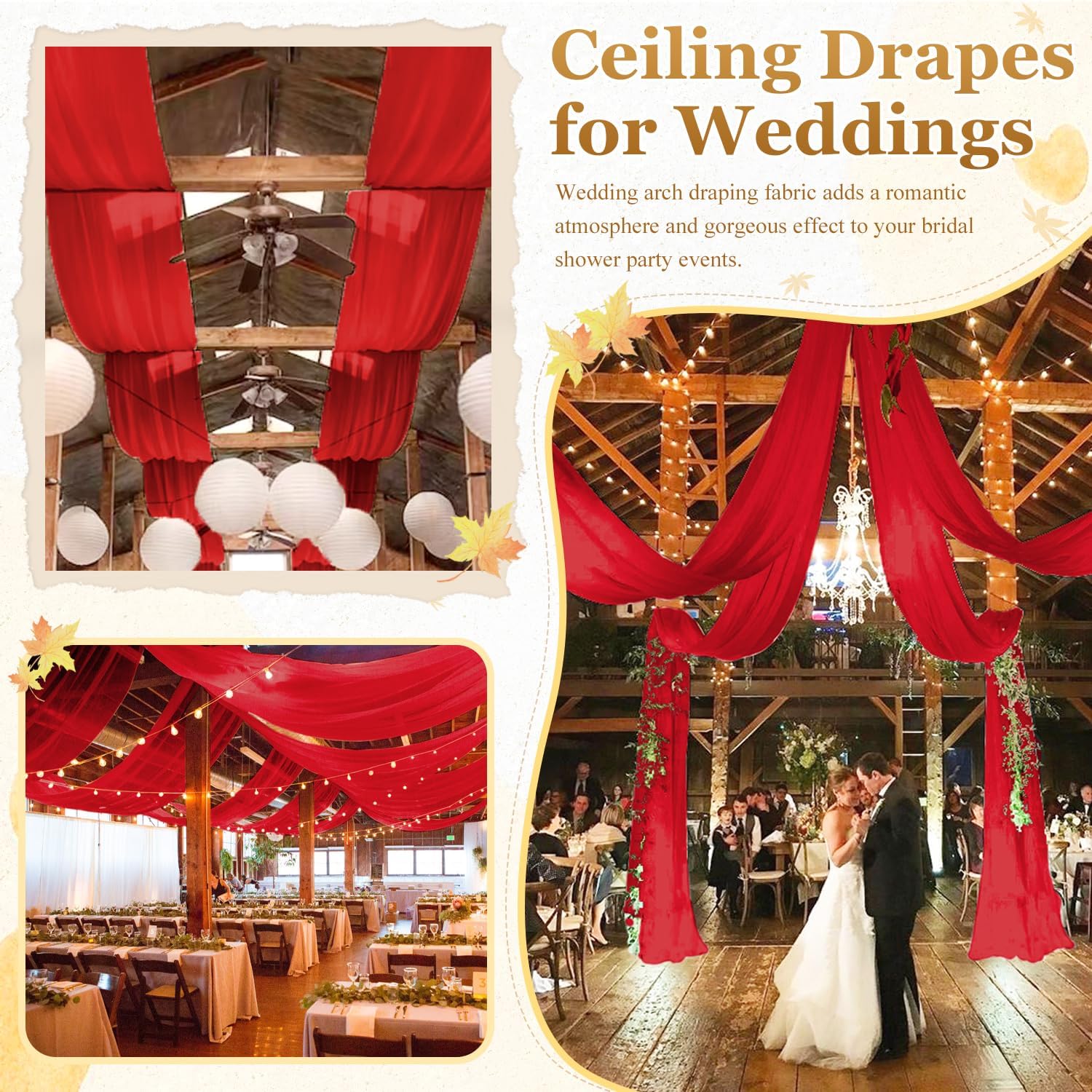 - ⭐Size & Color - Ceiling Drapes for Weddings: Our red ceiling drapery contains 6 panels. Each panel is 5FT width x30FT length. Wedding arch drapes is long enough creating a great eye catching detail in wedding party events decor.