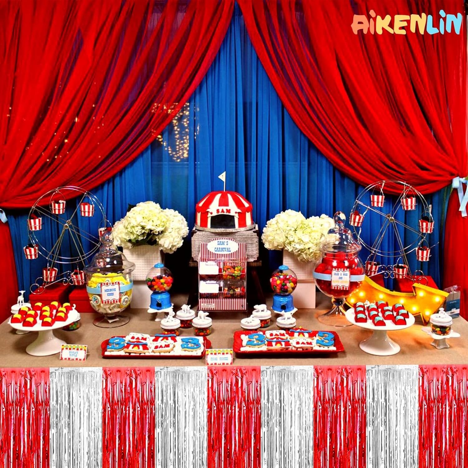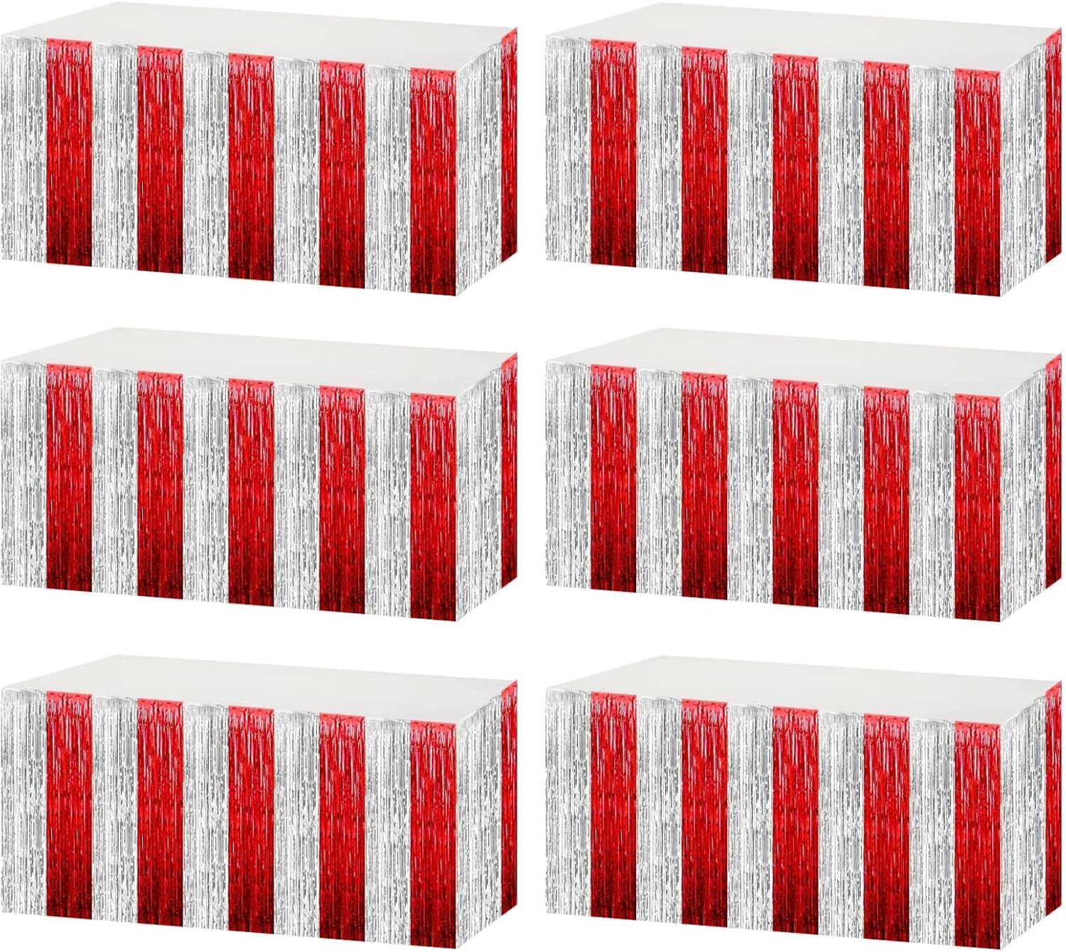 6 Pack 29x108 Inch Red Silver Metallic Foil Fringe Tinsel Table Skirts for Rectangle Tables Streamer for Wedding, Parade Floats, Circus Welcome Carnival Birthday Valentine's Day Party Decoration
