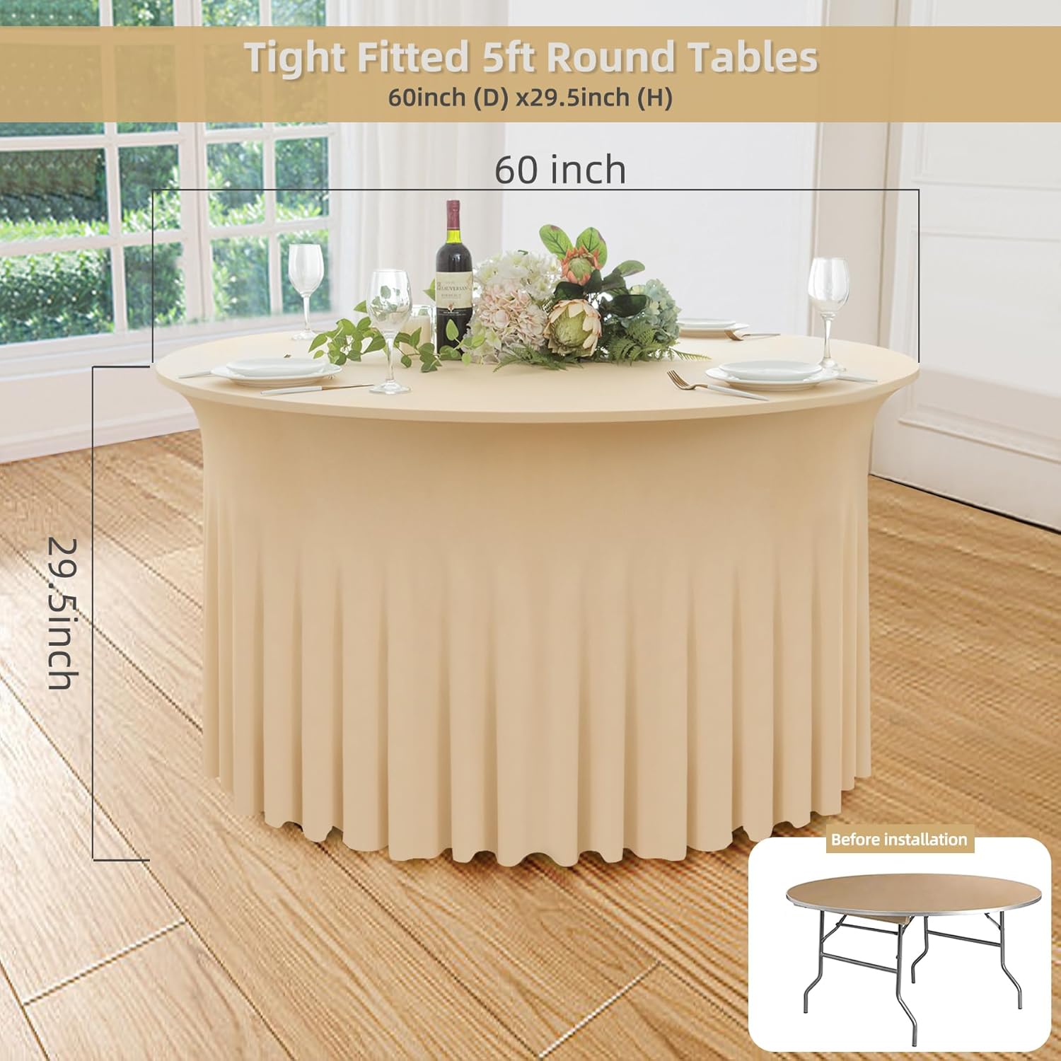 - 【Package and Size Champagne Round Tablecloths】 - Your Package will come with 4 pack champagne round spandex tablecloths 120 inch,the size of each tablecloth is 60 inches in diameter and 29inch in height,tighy fitted 5ft round party tables.Manteles de mesa de tela para fiestas.