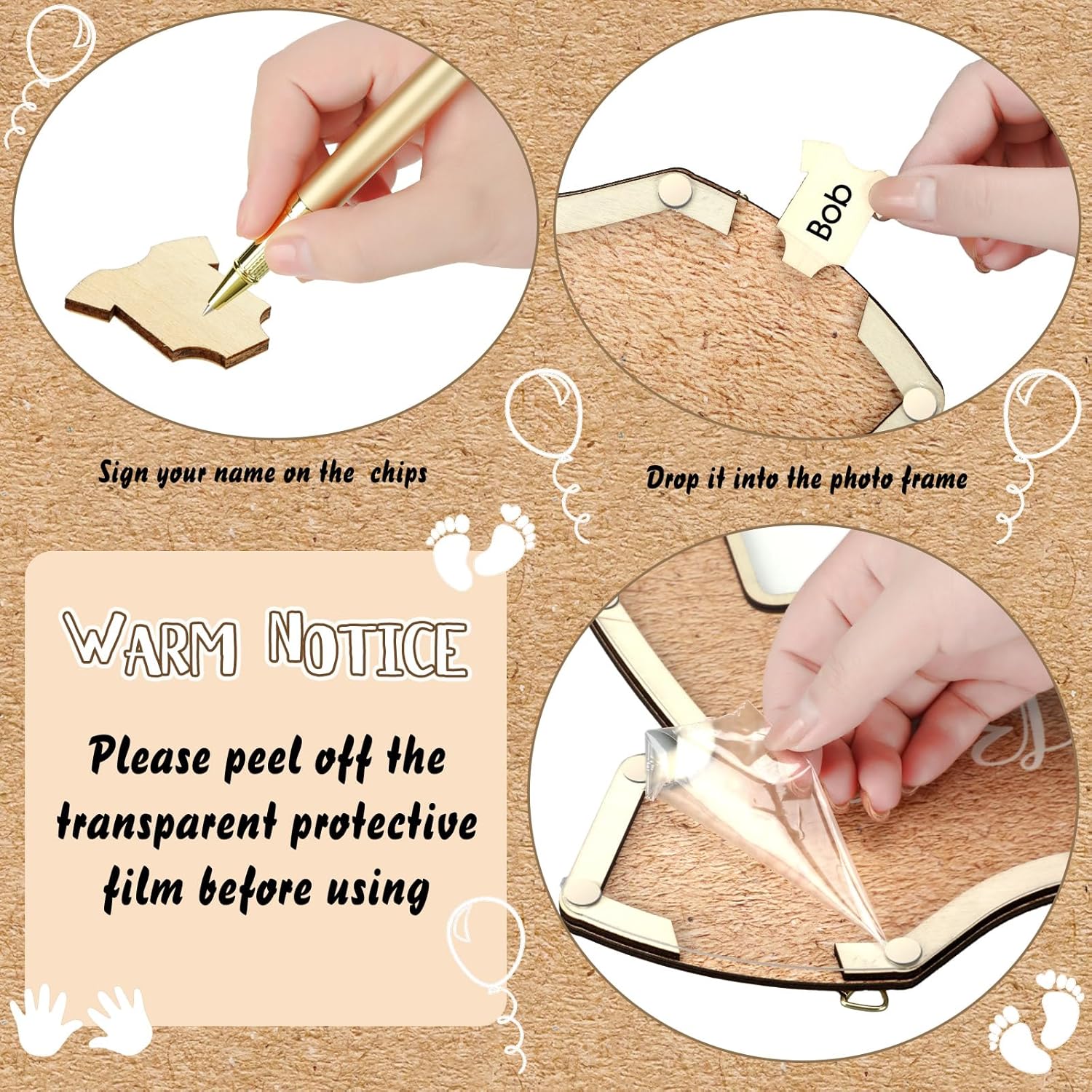 - Practical Set: the kraft baby shower decorations contain 1 baby bodysuit themed wooden picture frame with display stand, 1 baby bodysuit themed wooden box, 60 pcs wooden slices, 1 golden pen (black ink), the practical set can well meet your various demands
