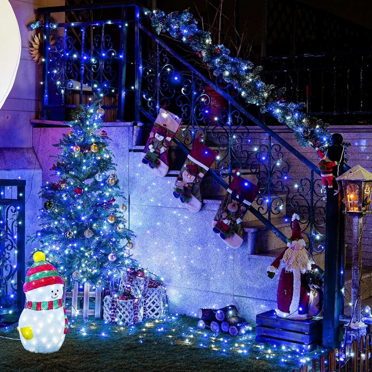 JMEXSUSS 2 Pack Blue & White Solar String Lights, Each 100 LED 33ft, Waterproof, 8 Modes for Outside Garden Patio Party Decoration