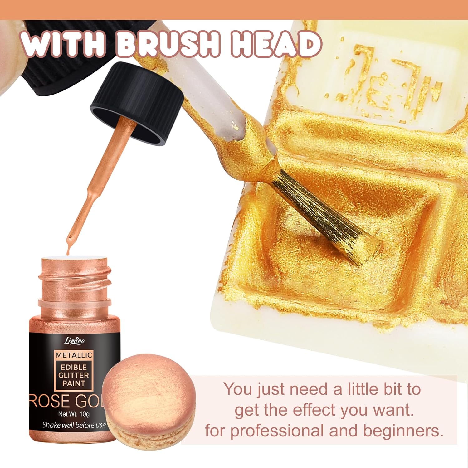 - METALLIC EDIBLE GLITTER PAINT - Specially crafted for food and baking decoration to get a metallic finish or add a gold-plated effect. All colors are brilliant and amazing. This fine texture edible cake paint can provide a high luster glitter effect to your cakes, chocolates, and candy!