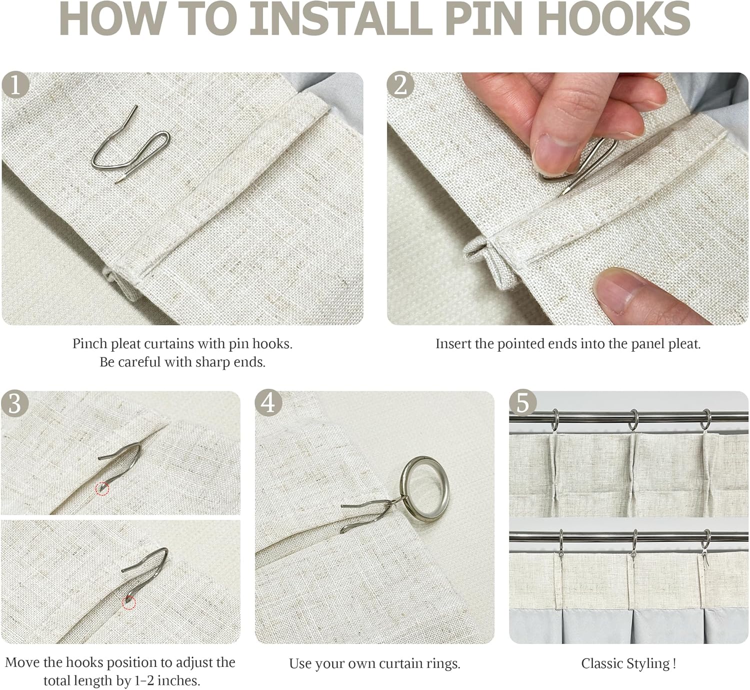 - Multiple Hanging Ways:Rustic Casual curtains have many hanging options to meet your different home décor needs:back tabs(4 inch),clip rings,ring hooks or for track system.Please note that 18 hooks are in the package but clips and rings are not included.Two weighted hems sewn at the bottom increase the draping effect.Moving the pinhooks position to adjust the total height by 1-2 inches
