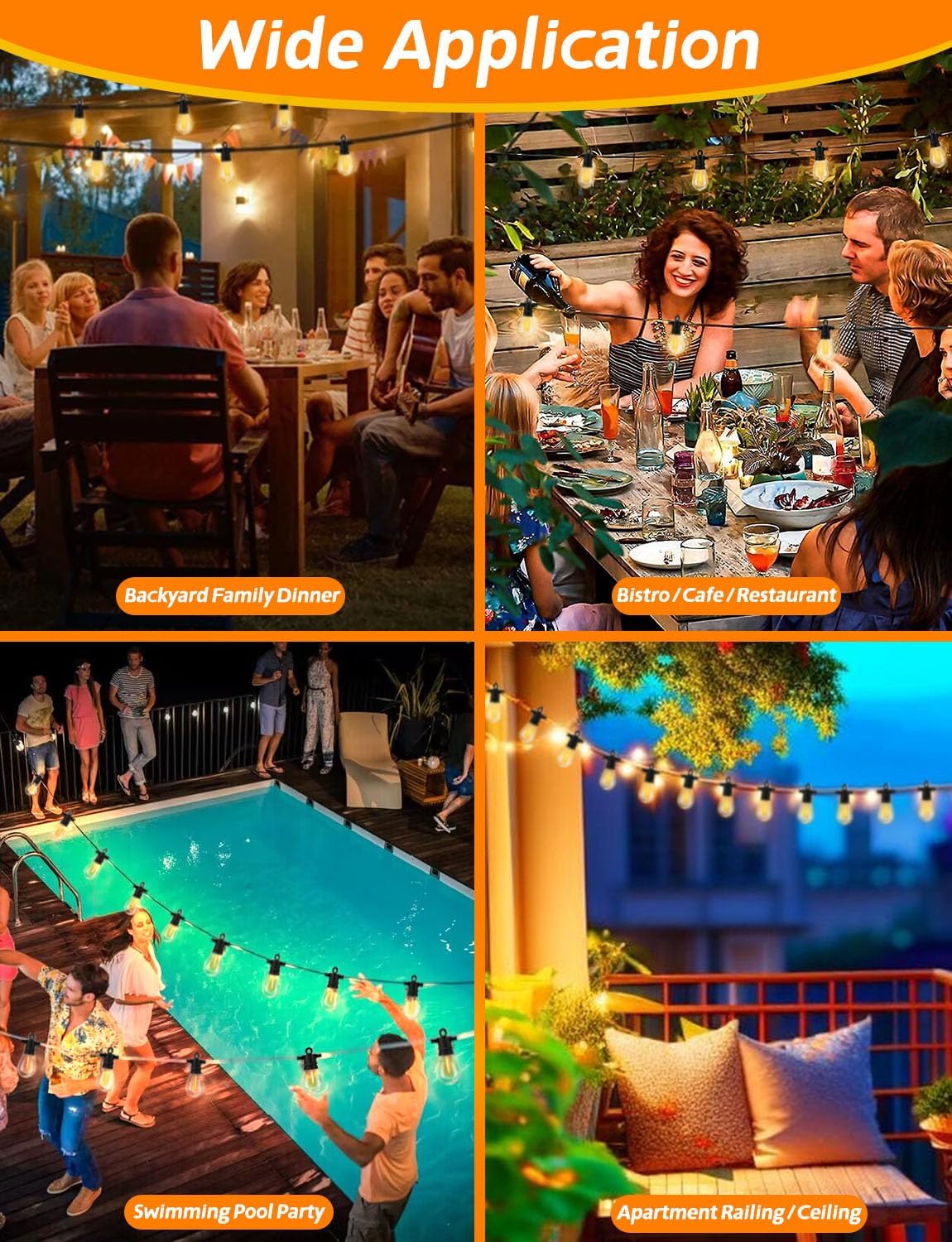 - 【Widely Used & Easy to Install Bistro Lights】: The length of the outdoor string lights is 26ft, can be connected end to end up to max 33 strands for all occasions, enough for your backyard, patio, garden, bistro, pergola, porch, balcony, aisle, camping, party and any other outdoor places you want to decorate.