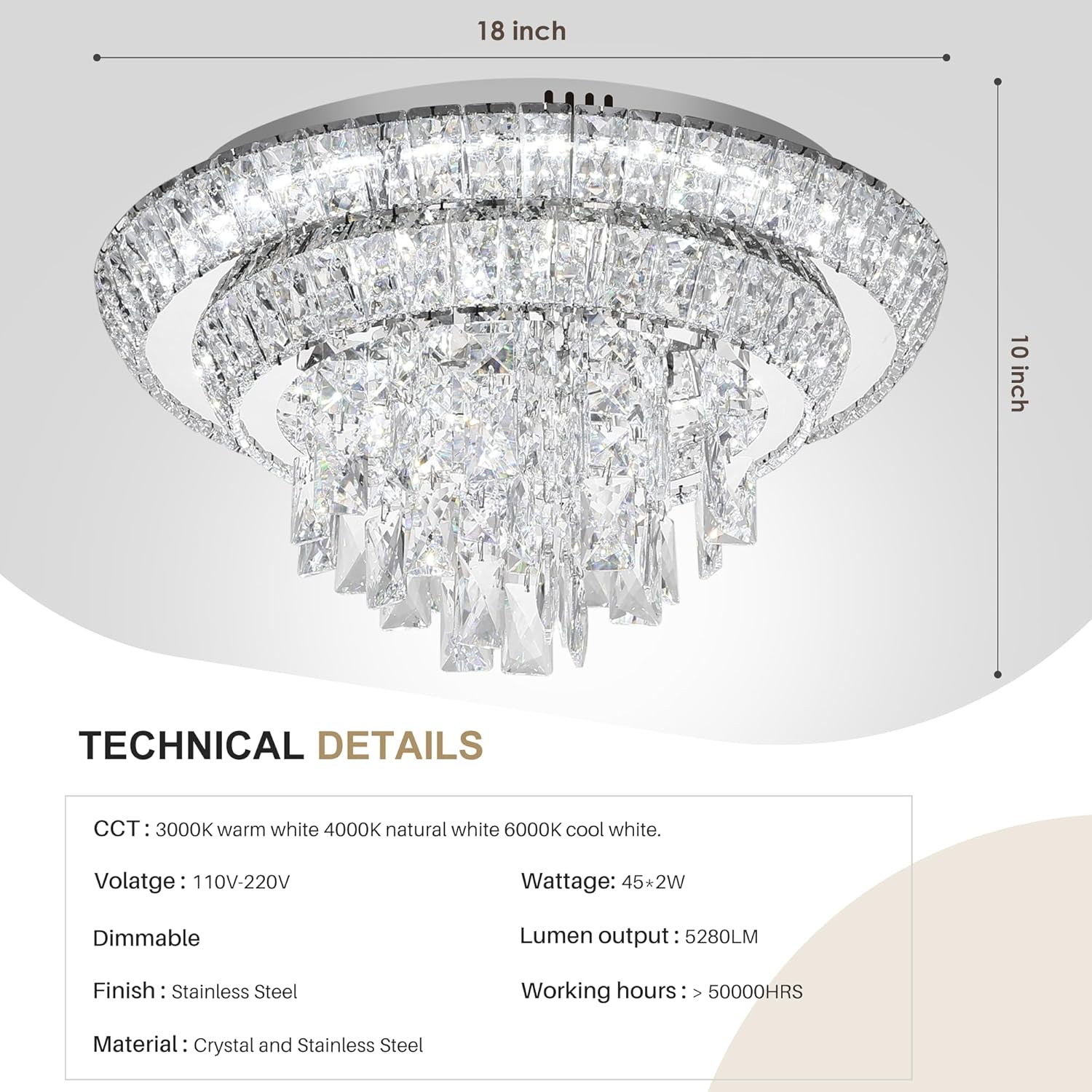 - Crystal flush mount ceiling light: made of K9 crystal and stainless steel; 3 modes lights Warm/natural/white is adjustable with wall switch; Coming remote is easy to control for all functions and temp or brightness's control.
