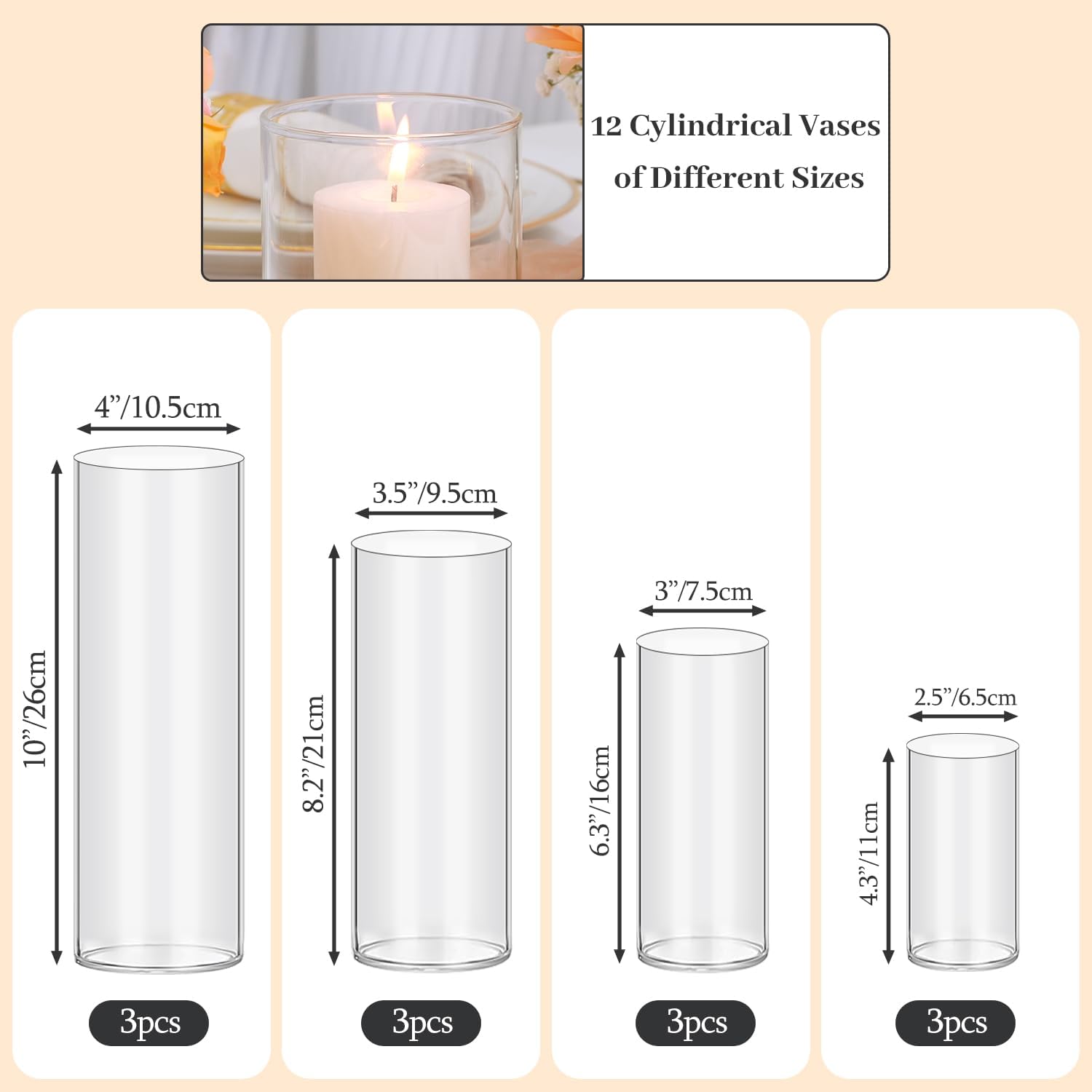 - Cylinder Vases Set: 4, 6, 8 and 10 inch tall combination of 12 pcs cylinder glass vases for centerpieces, it designed with a minimalist touch, presenting a smooth and flawless appearance. These glass vases feature a rounded shape that the elegance of any flowers in an impeccable manner. Undoubtedly, it is a must-have choice for flower enthusiasts!