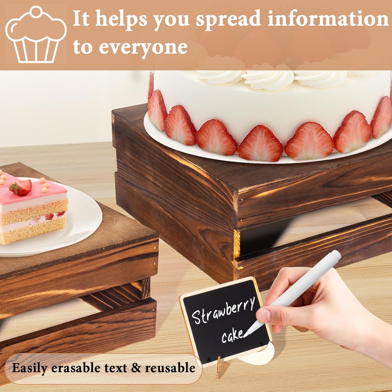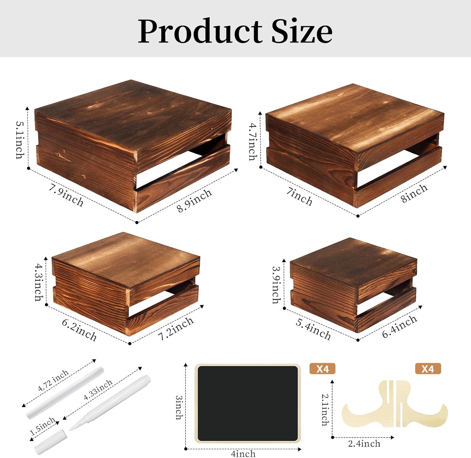 - Your Party's Sweet Companion: You will receive a set of 4 wooden cake stand risers (available in 4 sizes), 4 wooden signs and 2 pens, enough quantity and different sizes to meet the needs of different sizes of cakes, snacks and desserts for display. The wooden signs can be used to write down hints for ease of use while adding elegance to your dessert table.These wooden stackable display boxes will not take much displaying space