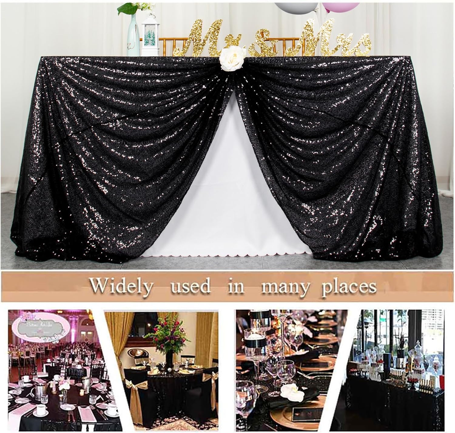 - Black Tablecloth: full dense sequins embroidered on mesh fabric, making glitter tablecloths not easily see through