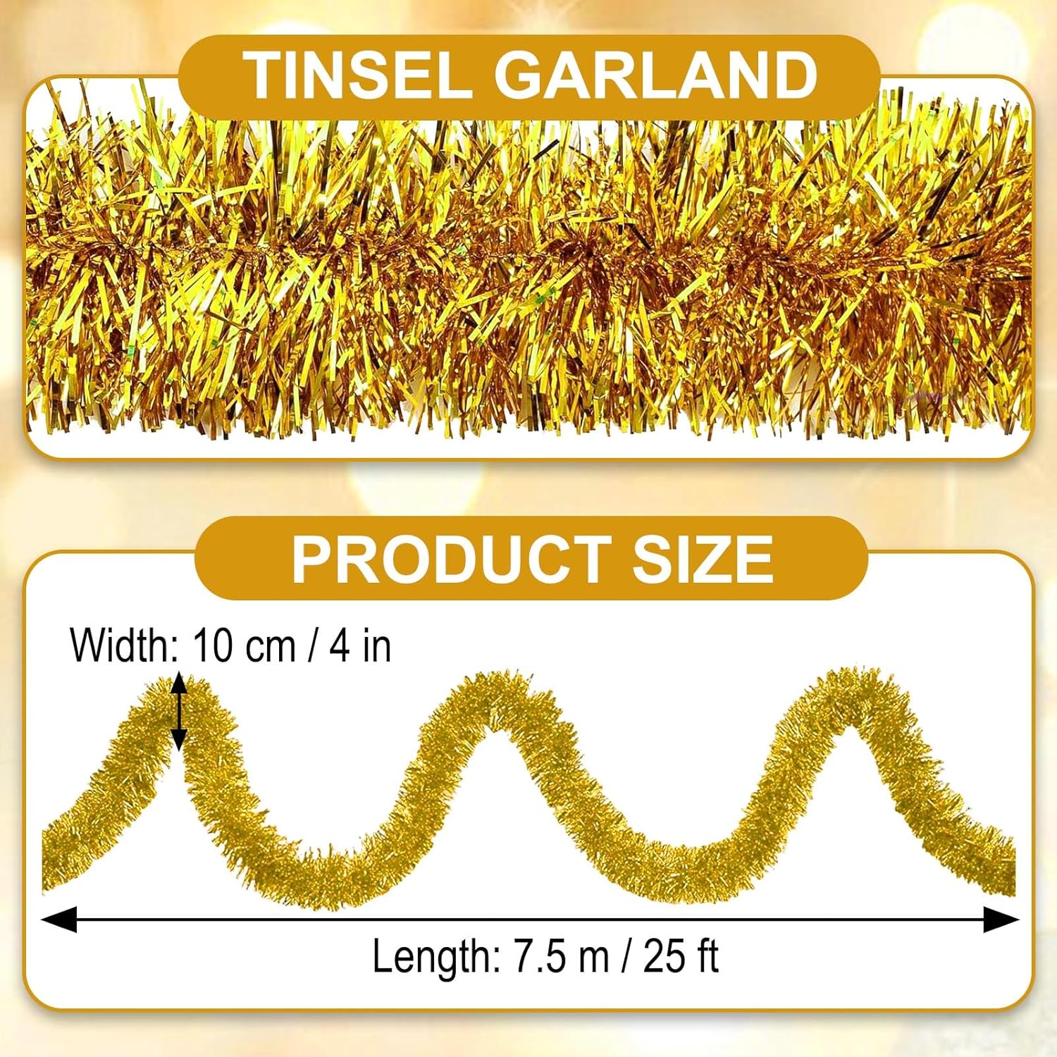 25 Feet Gold Christmas Tinsel Garland, Metallic Foil Twist Garland Wall Hanging Tinsel Banner Backdrop for Parade Floats, Easter, Mother's Day, Birthday Party Decorations (4in x 25ft)