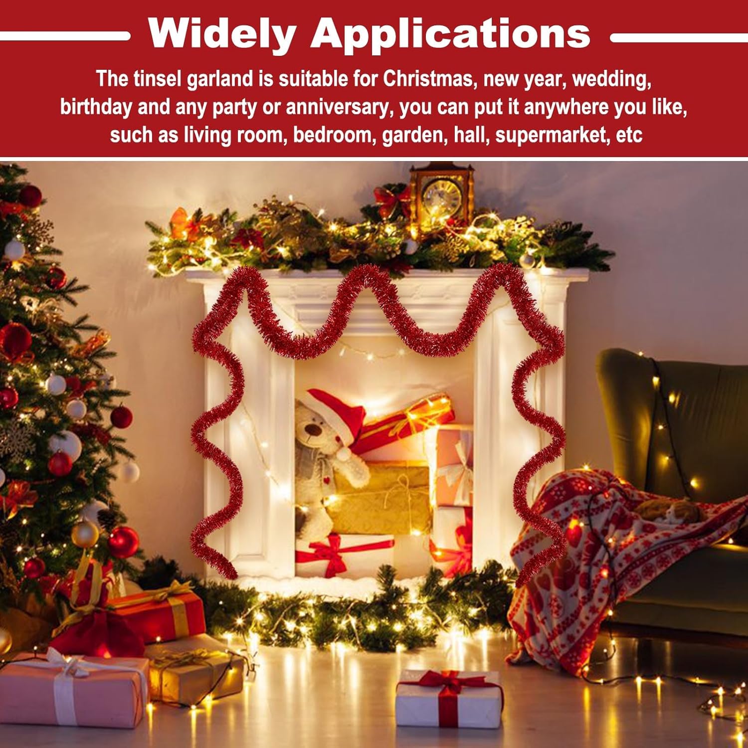 - Wide Application: Suitable for all kinds of special days, such as christmas, new year, valentine's day, halloween, festivals, wedding, engagement, bridal baby shower, graduation celebrations. The tinsel garland are perfect decorations for party, home decorations, parade float, garden, christmas tree, christmas wreath, wall, ceiling, door, hedge, stair rail, doorway, window, pole, table and so on
