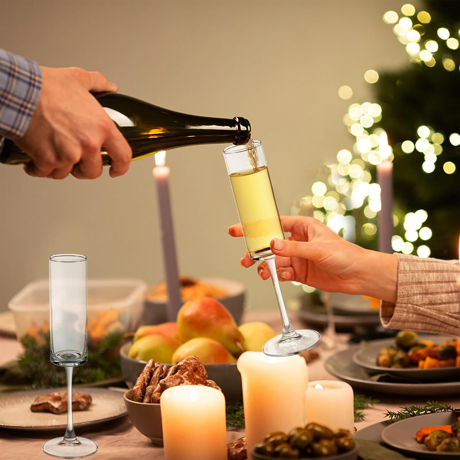 - 【Perfect Size】Set of 6/12/24 glass champagne flutes,each goblet can holds approximately 6 ounces/180 ml of liquid,With dimensions of 9.8 inches tall, 1.8 inches in diameter at the top, and 2.8 inches at the base,these glasses are designed to enhance the aroma and taste of your favorite champagne, providing an optimal drinking experience.Comfortable grip, non-slip base to ensure the stability.